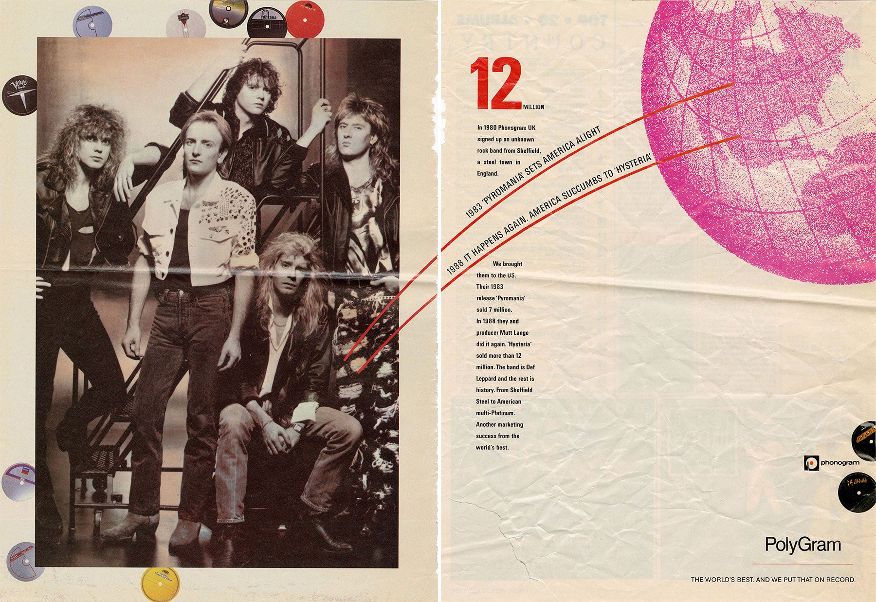 Two-page promotional spread from PolyGram celebrating the multiplatinum success of Pyromania and Hysteria. This advert was clipped from a 1988 issue of Billboard magazine. From the Collection of Def Leppard.