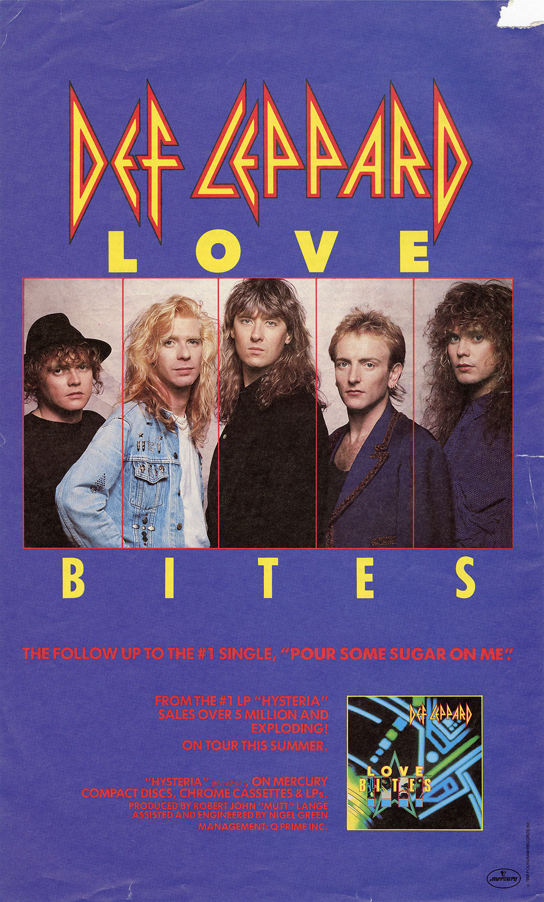 Mercury Records promotional ad in support of "Love Bites", the follow-up single to "Pour Some Sugar On Me". The advert was clipped from The Album Network Magazine dated 29 July 1988. From the Collection of Def Leppard.