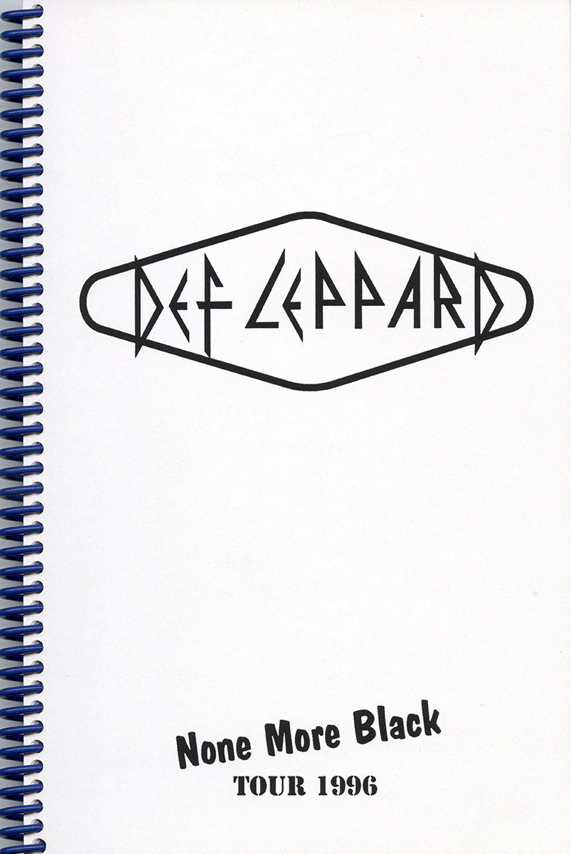 The cover of a spiral-bound tour itinerary book that details travel from May to August 1996 for the Slang World Tour, aka the "None More Black" Tour. Contained within: venue information, flight numbers, hotel accommodations, a personnel list, and after-show travel plans from Bangkok all the way to Little Rock. From the Collection of Def Leppard.