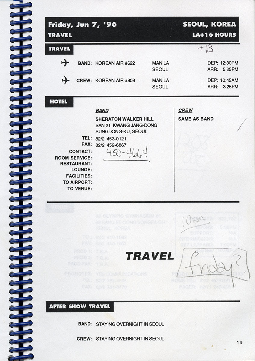 Daily travel sheet from a spiral-bound tour itinerary book that details flight, hotel, and after show travel plans for the Slang World Tour stop in Seoul, Korea. From the Collection of Def Leppard.