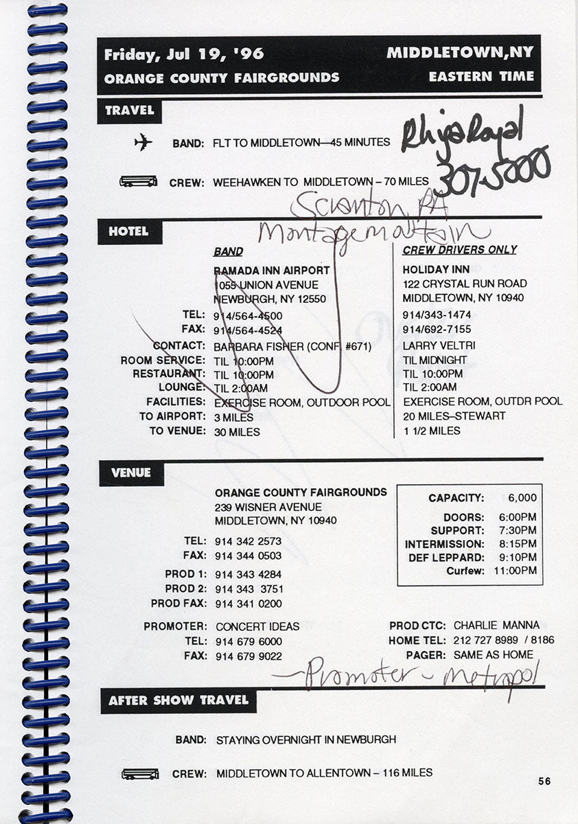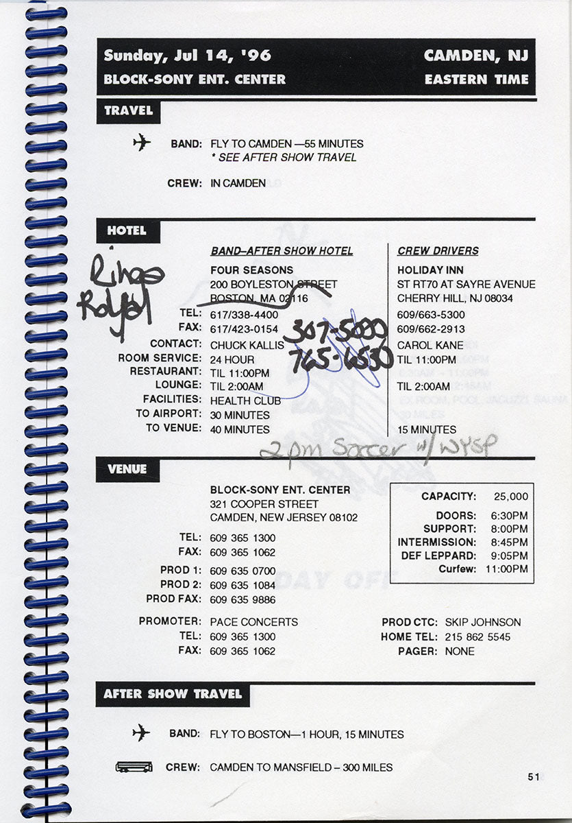 A travel sheet from the Slang Tour itinerary book lists hotel accommodations, venue information, and planned events for 4th July, 1996. This day’s plans included a soccer match with radio station WYSP, a performance at the Blockbuster-Sony Music Entertainment Centre, then a quick after-show flight to Boston. From the Collection of Def Leppard.