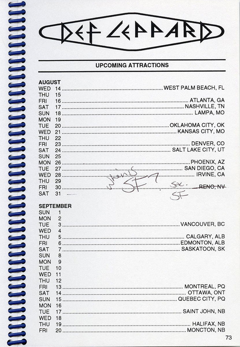 A page from the Slang Tour itinerary book notes upcoming tour dates. When this sheet was put together, the Northern California performances were still being scheduled. From the Collection of Def Leppard.