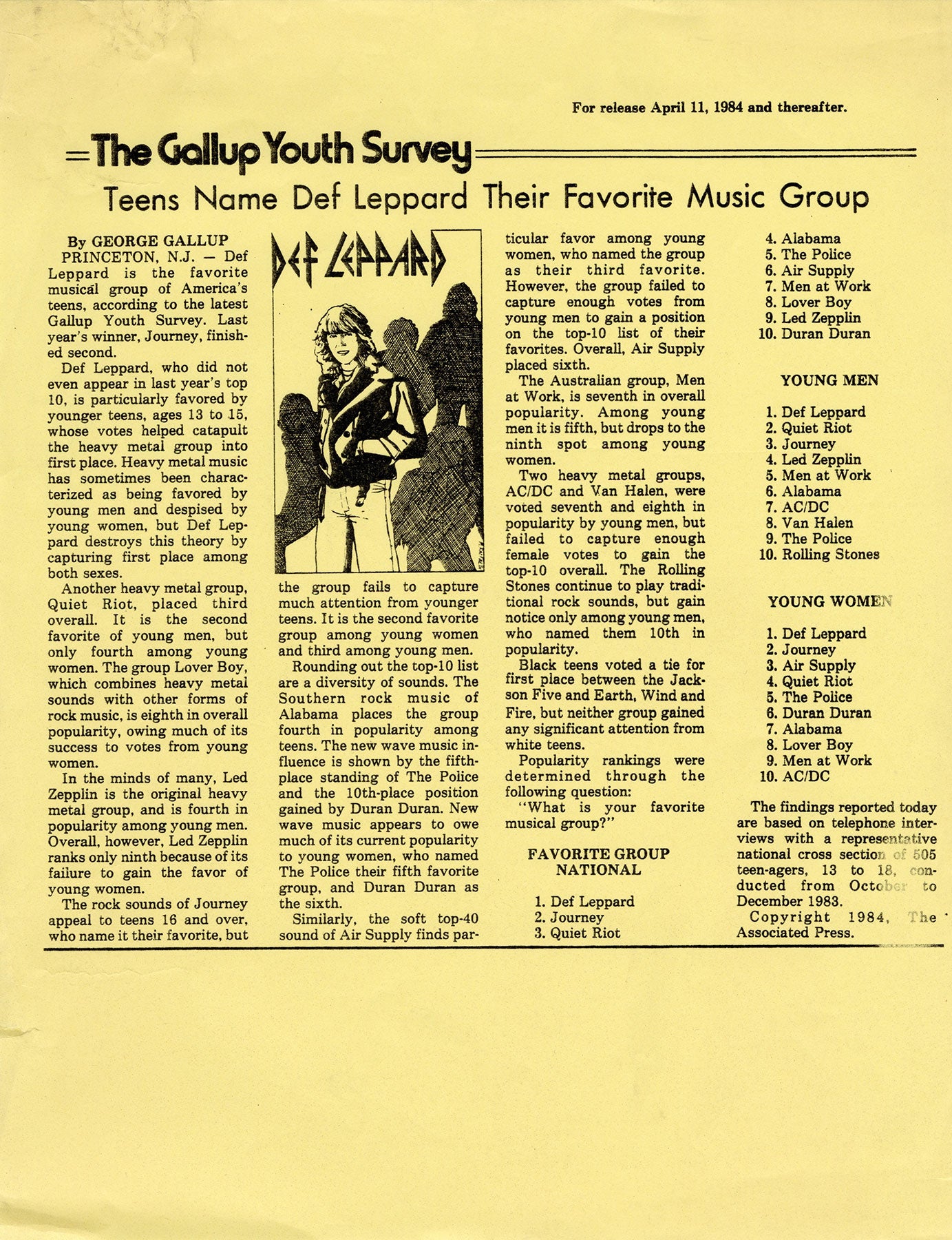 Photocopy of an Associated Press article, 11 April 1984, reporting that Def Leppard conquered a Gallup Youth Survey as the top-rated band amongst US teens. The article noted that the band's popularity with both male and female fans destroyed the theory that heavy metal music is "favored by young men and despised by young women." From the Collection of Def Leppard.