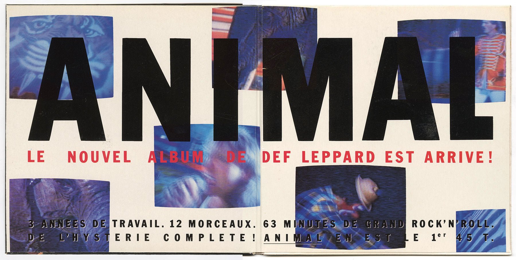 French record sleeve for the "Animal" single, 1987. The text reads, "Animal. The new Def Leppard album is coming. 3 years of work. 12 tracks. 63 minutes of great rock 'n' roll. Complete Hysteria! Animal is the 1st single." From the Collection of Def Leppard.