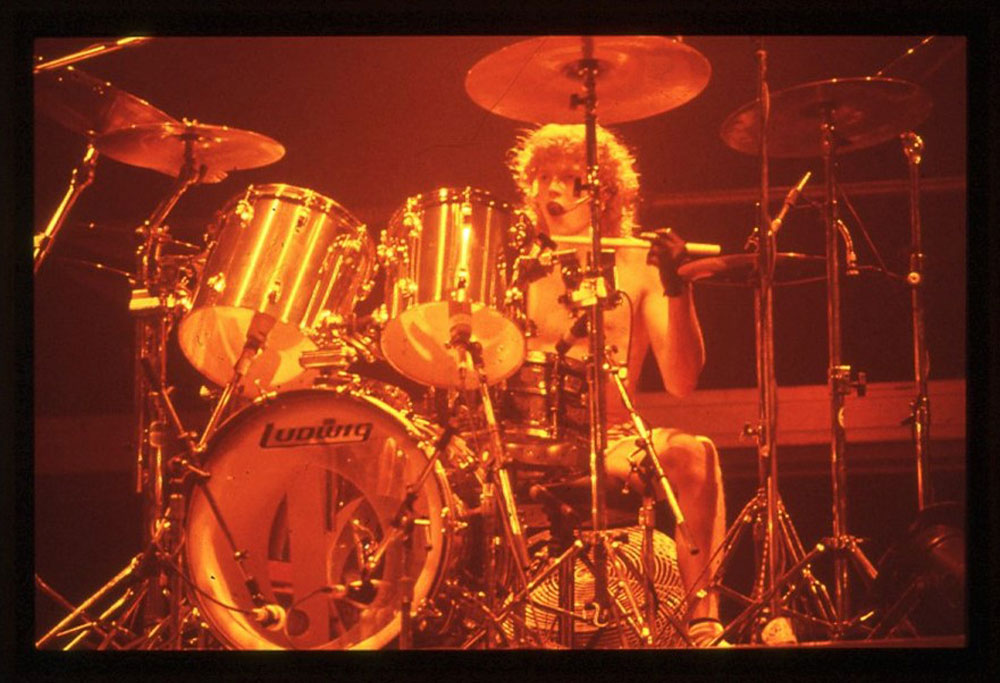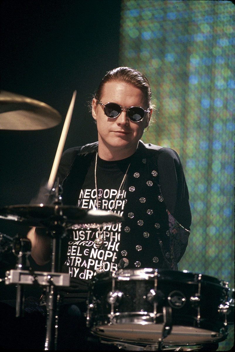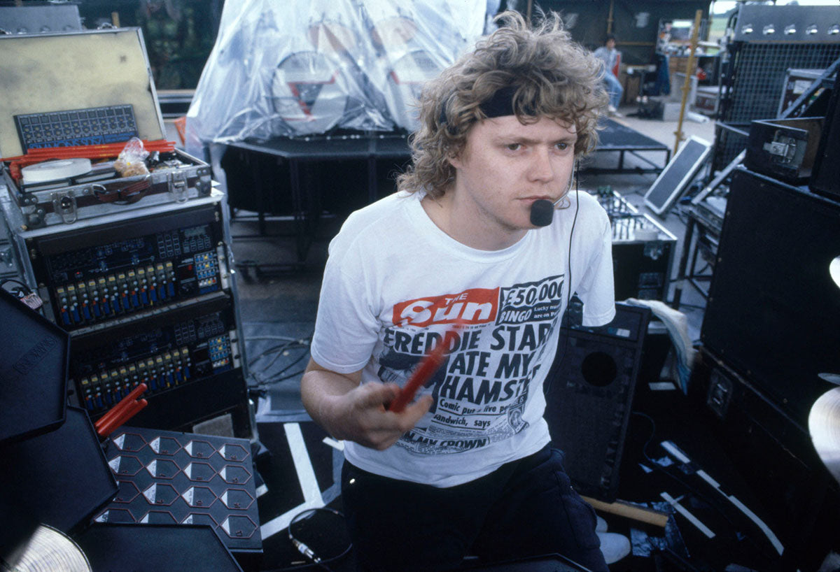Rick sports all black and is drum-ready in this Slang promotional photo shoot. Photo: Cynthia Levine. From the Collection of Def Leppard.