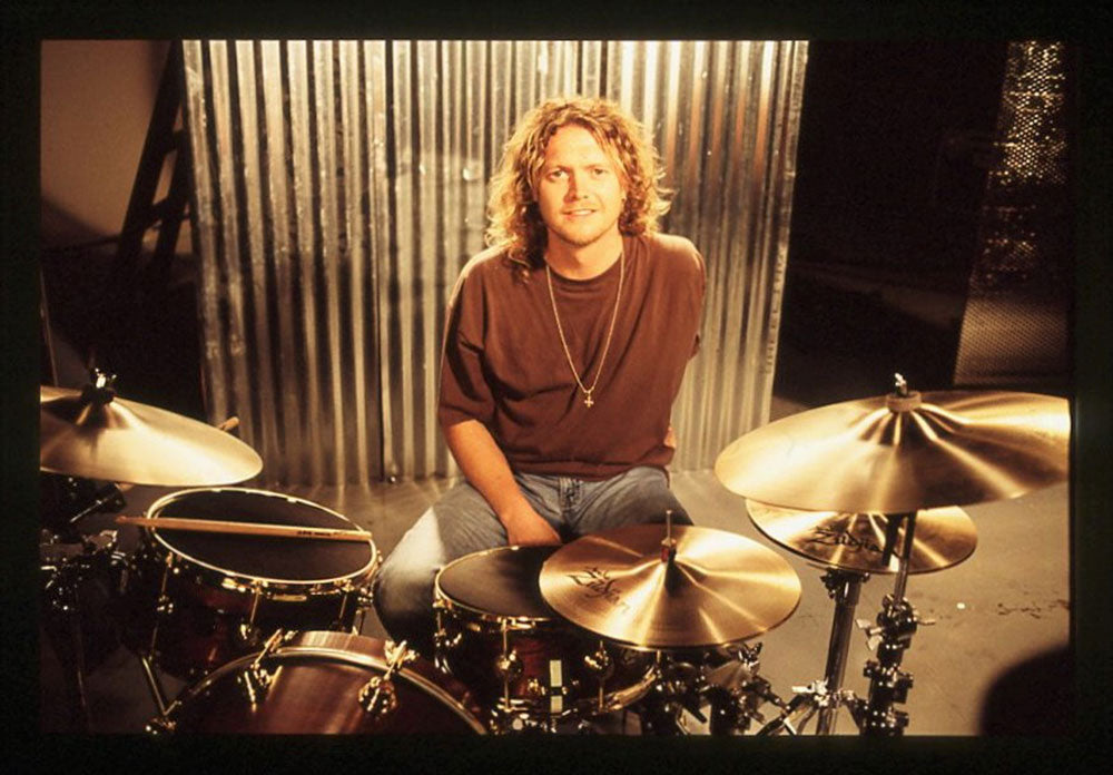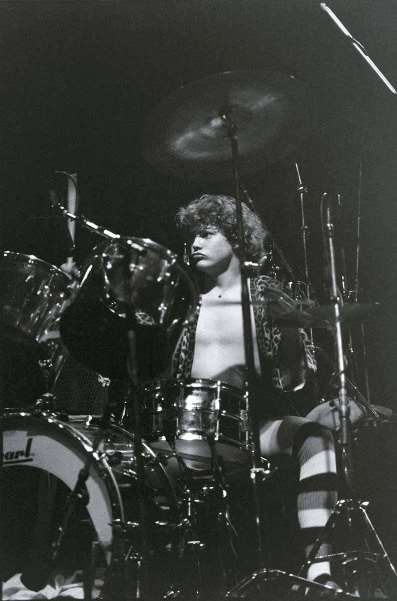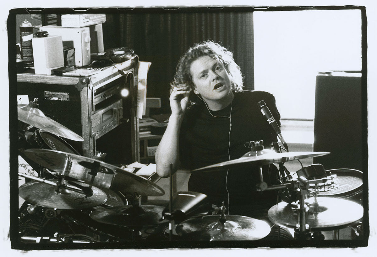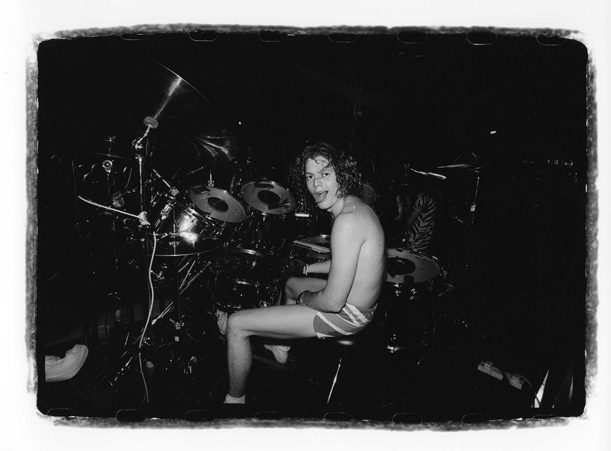 Rick sports all black and is drum-ready in this Slang promotional photo shoot. Photo: Cynthia Levine. From the Collection of Def Leppard.