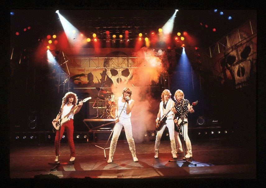 Joe, Phil, Sav, and Steve a rare line-up on the Hysteria Tour, in-the round configuration. Rick is playing to the opposite side of the audience. Rick often said, "I had the best seat in the house." Courtesy of the Lorelei Shellist Private Collection.