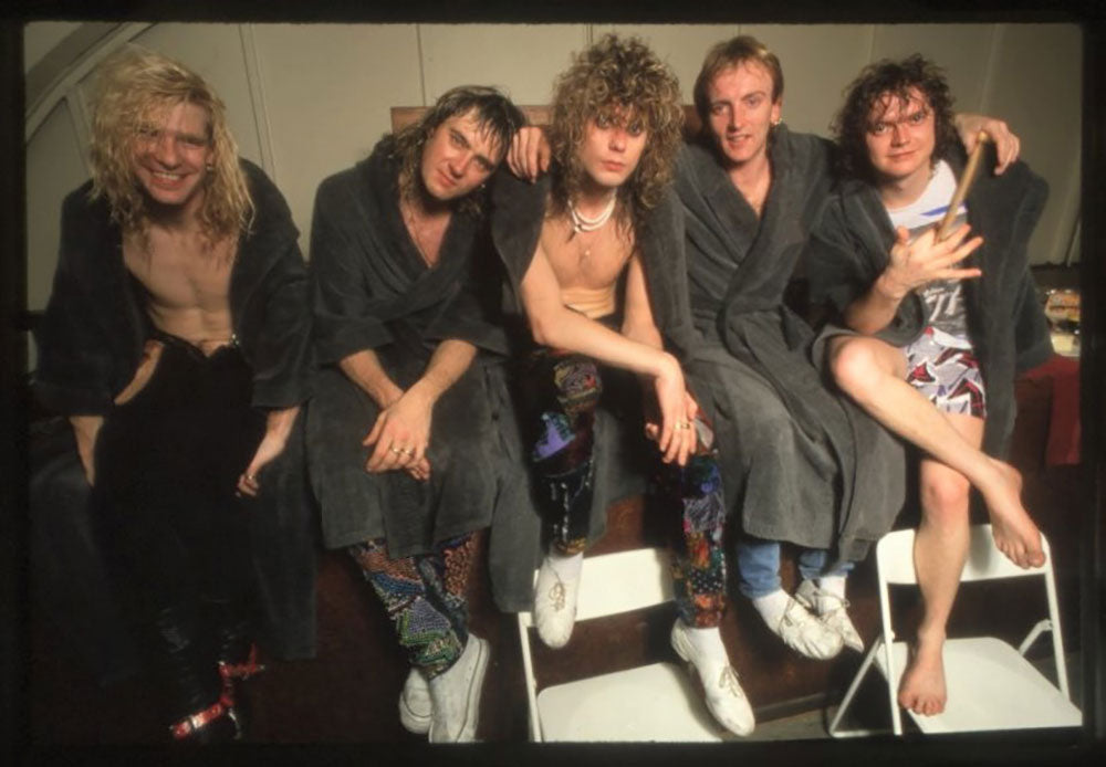 Steve, Joe, Sav, Phil, and Rick relax in comfy tour robes just moments after leaving the Hysteria tour stage, 1988. Photo: Ross Halfin. From the Collection of Def Leppard.