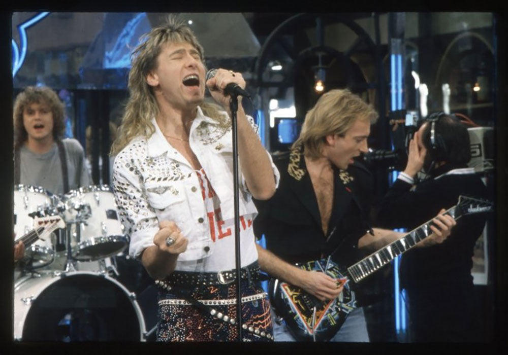 Photo of Def Leppard's 1988 appearance on the German television show "Spruch Reif." Photo: Ross Halfin. From the Collection of Def Leppard.