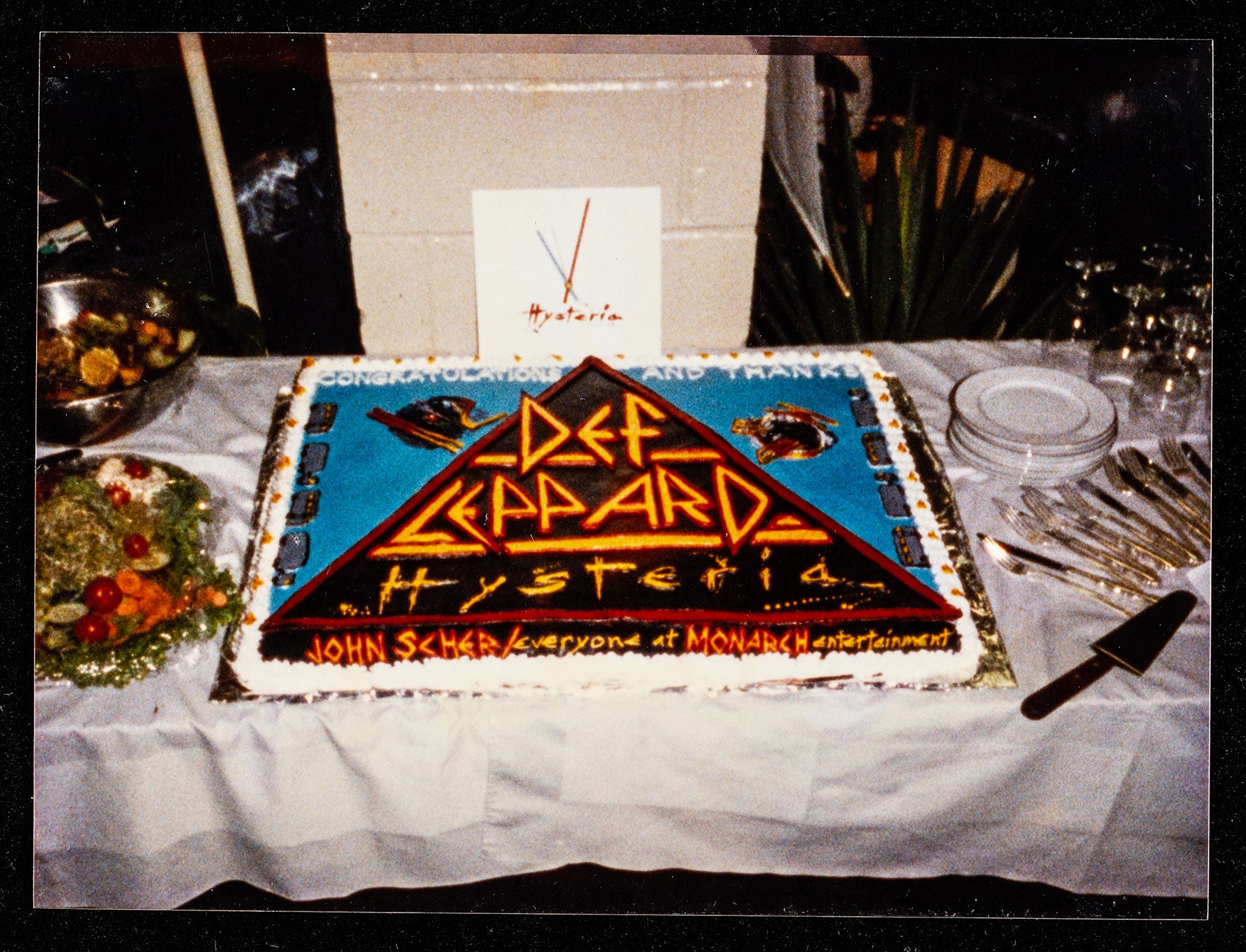 Photograph of a custom sheet cake from promoter John Scher and Monarch Entertainment commemorating Def Leppard's three sold-out Hysteria Tour shows at the Brendan Byrne Arena, East Rutherford, New Jersey, September 1988. These three New Jersey in-the-round shows rocked over 20,000 fans each. From the Collection of Joe Elliott.