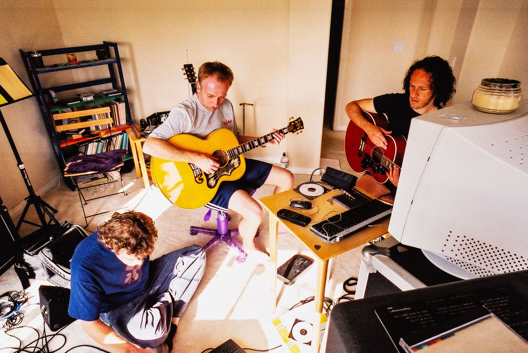 Rick, Phil, and Viv sit together to work on material for Slang in a rented villa in Southern Spain, 1994. Phil recalled, "We had this villa. We set a drum kit up in there and it was a very creative period...very different and experimental for us...very rough and less processed." From the Collection of Joe Elliott.
