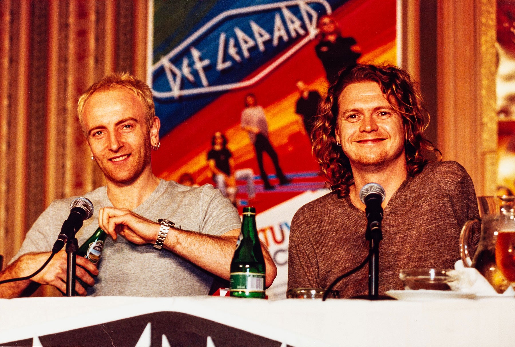Phil and Rick participate in a press conference in support of the Slang World Tour performances in South Africa, December 1996. The band played in Johannesburg, Durban, and Cape Town. From the Collection of Joe Elliott.