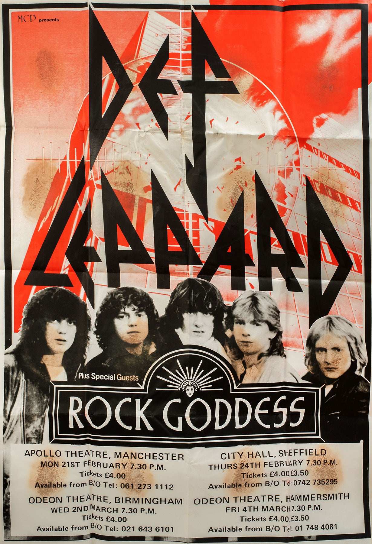 Poster from the kickoff performances of the Pyromania Tour UK leg, beginning with a stop at Apollo Theatre, Manchester, England, 21 February 1983, with supporting act Rock Goddess. From the Collection of Joe Elliott.