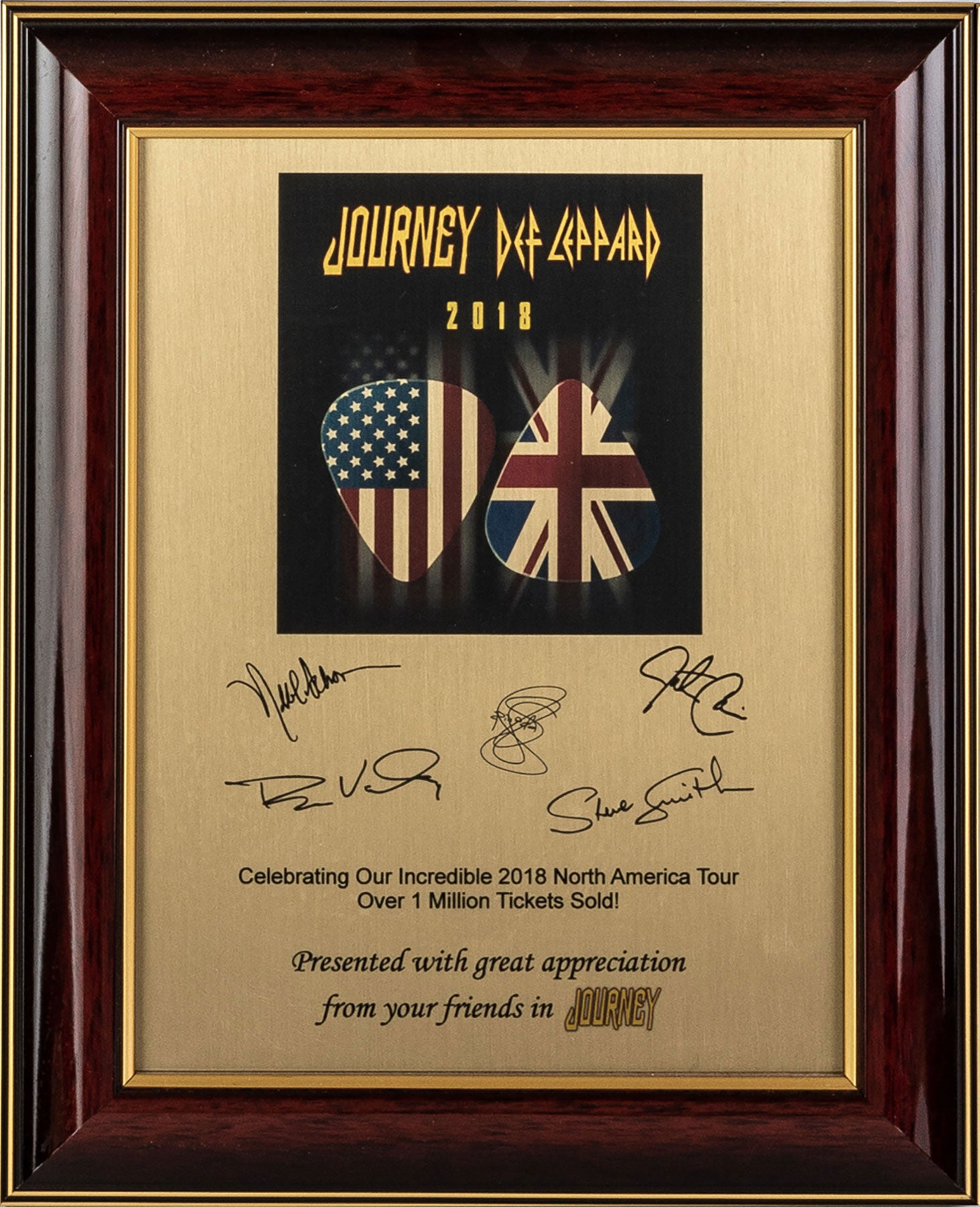 Autographed plaque from the members of Journey to Def Leppard commemorating over one million tickets sold on their 2018 North American co-headliner tour. From the Collection of Joe Elliott.