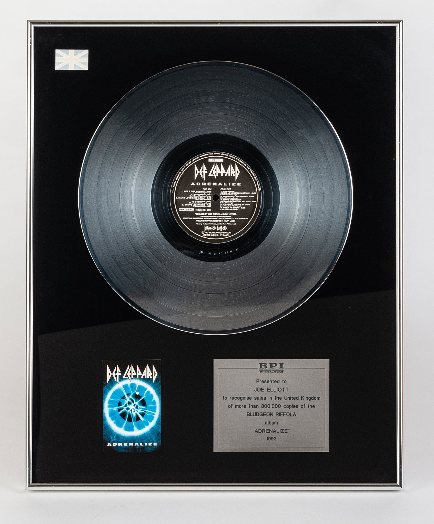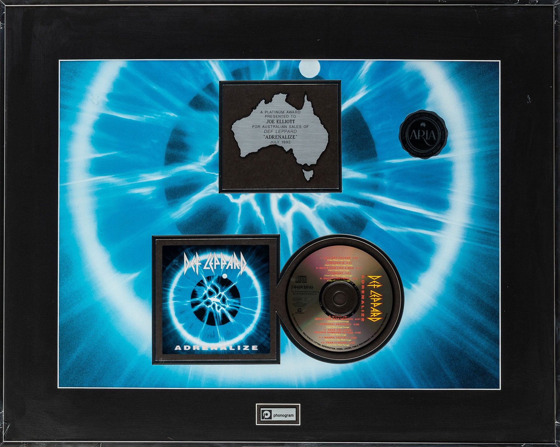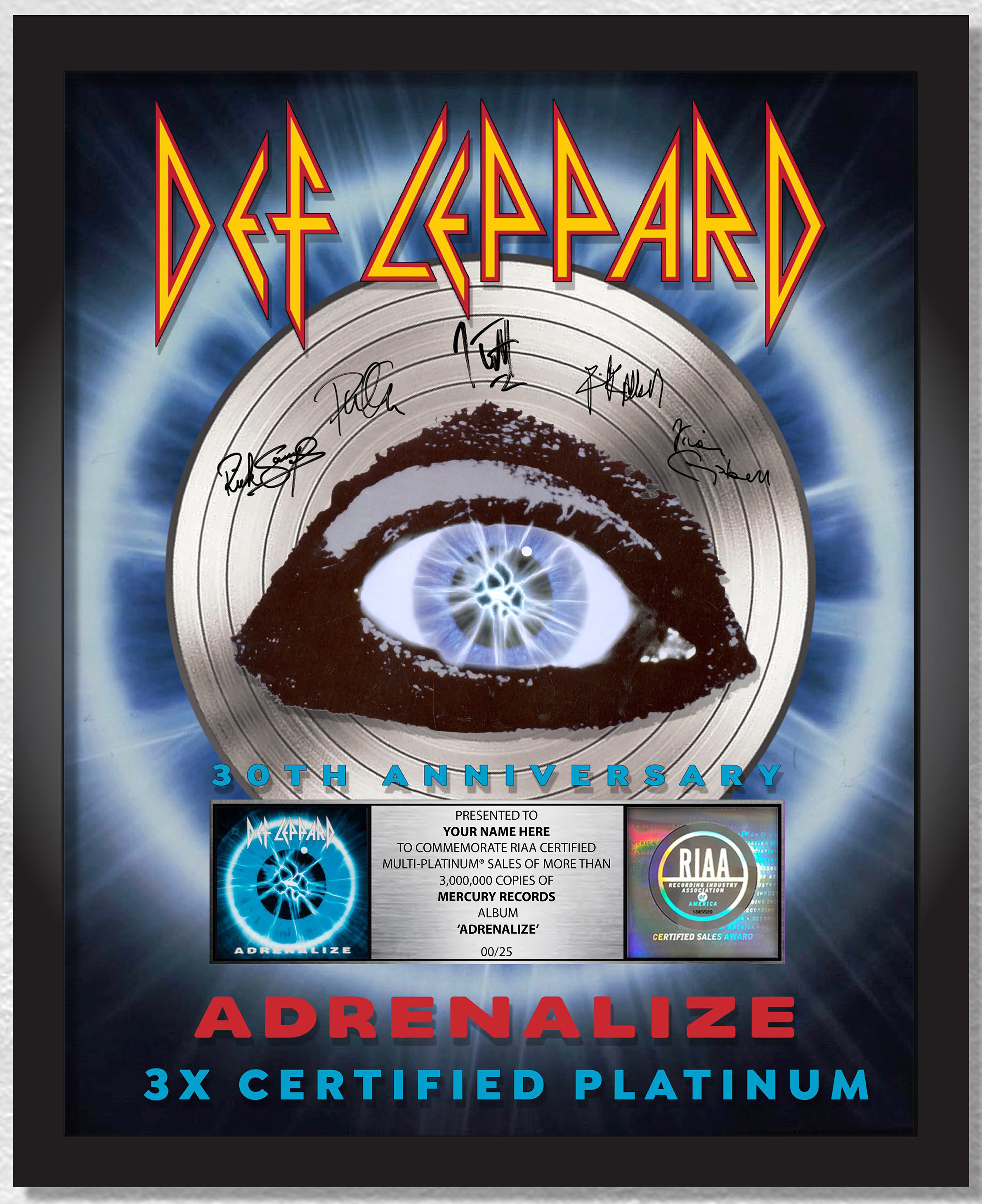 A 12” vinyl record; The official RIAA numbered hologram; Personalized engraved inscription plate; Printed plexi glass; Graphic background; Black wood frame; Official Def Leppard Vault / Definitive Authentic Certificate of Authenticity.