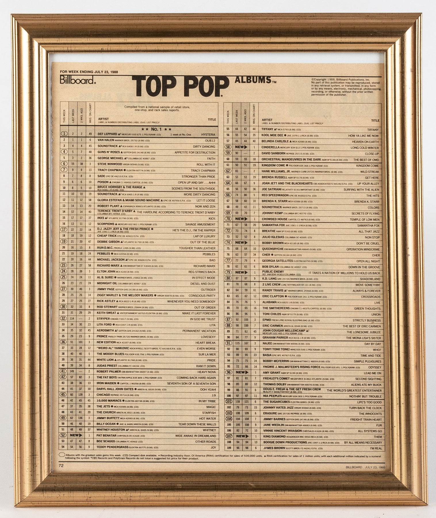 Framed Billboard chart from the week Hysteria finally hit the number one spot, 23 July 1988. The record had been on the charts for 49 weeks before finally conquering the Top Pop Albums category. From the Collection of Joe Elliott.