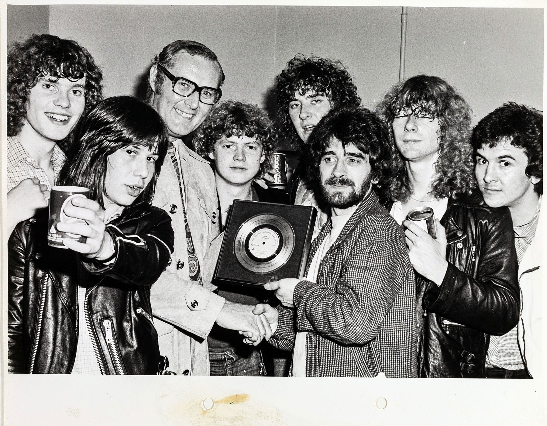 Sav, Pete Willis, Rick, Joe, and Steve celebrate the success of the Def Leppard EP with then-managers Frank Stuart-Brown and Pete Martin, circa 1979. From the Collection of Joe Elliott.