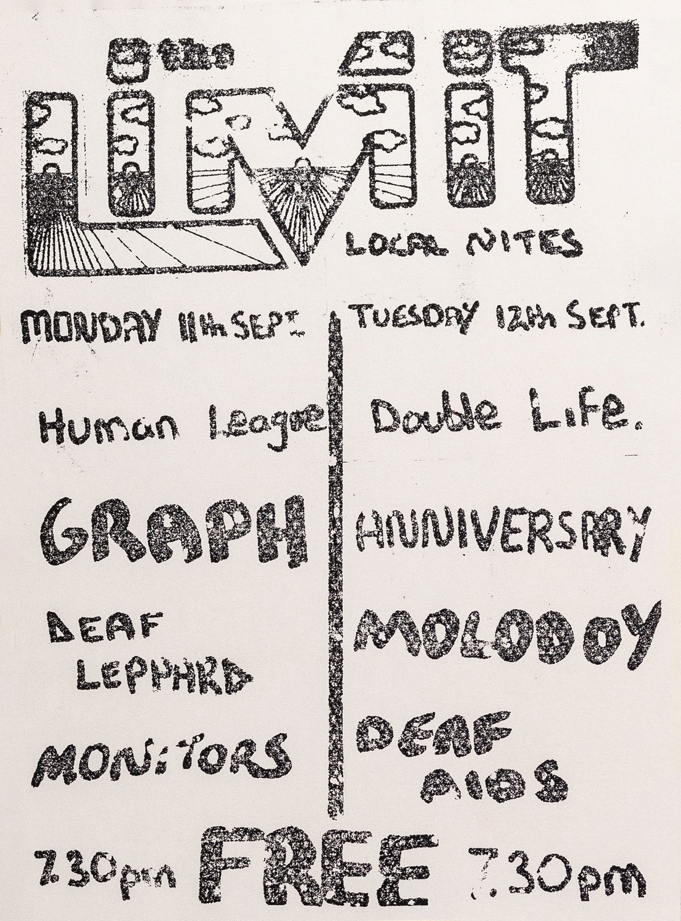 Flyer for Def Leppard's third public performance, opening for the Human League at The Limit, Sheffield, England, 11 September 1978. Joe recalls, "We'd frequented this place for years as punters just going down to watch other bands and drink and what have you. And they had these...what you call 'free festivals'. Or you didn't get paid to play but they let everybody in for free, so you were guaranteed a full house...we had a fanbase of friends that came down and just took over the front bit and made noise and made us feel important." From the Collection of Joe Elliott.