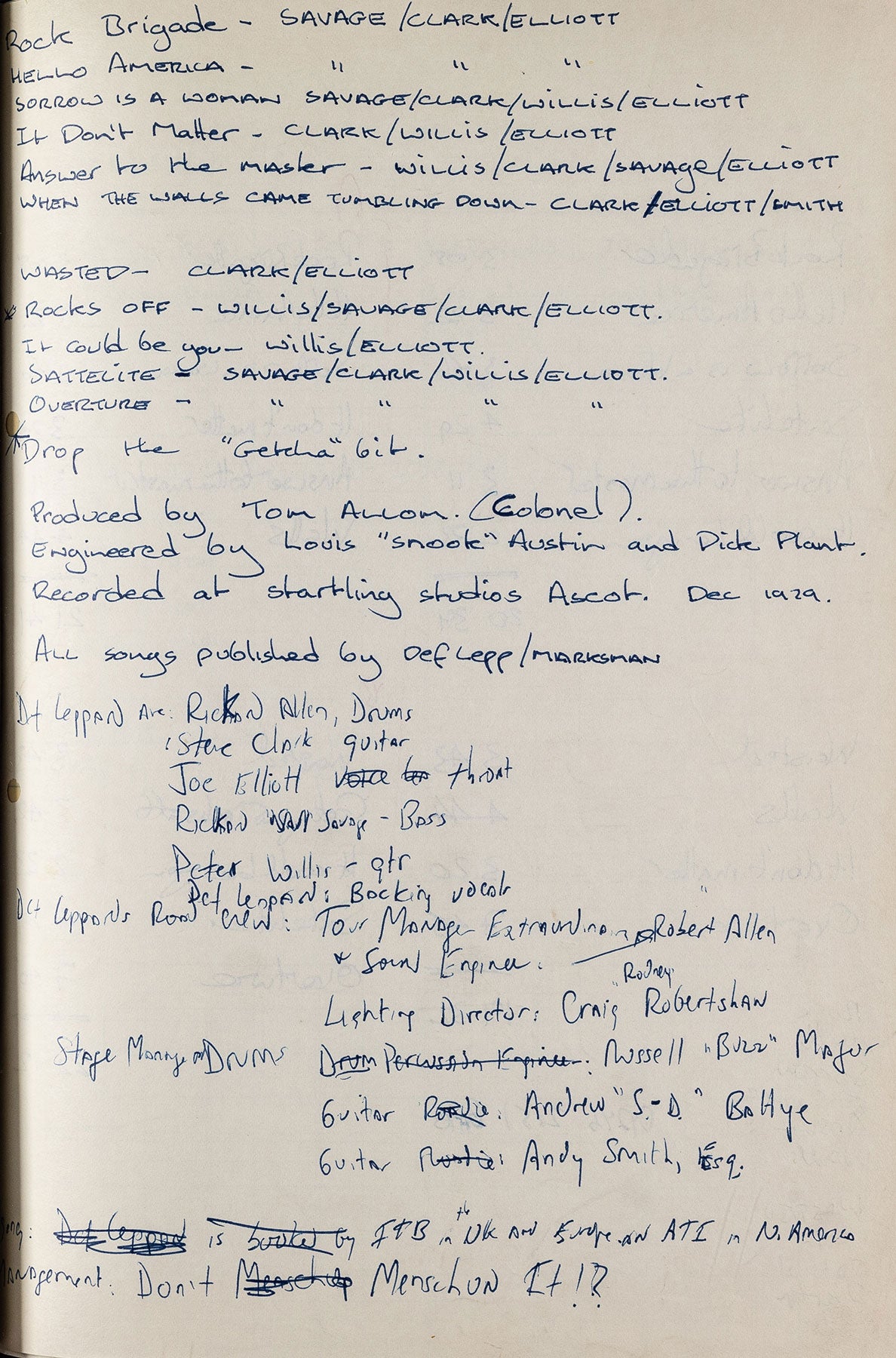 Handwritten production credits from On Through The Night, Def Leppard's debut full-length studio album, 1980. From the Collection of Joe Elliott.