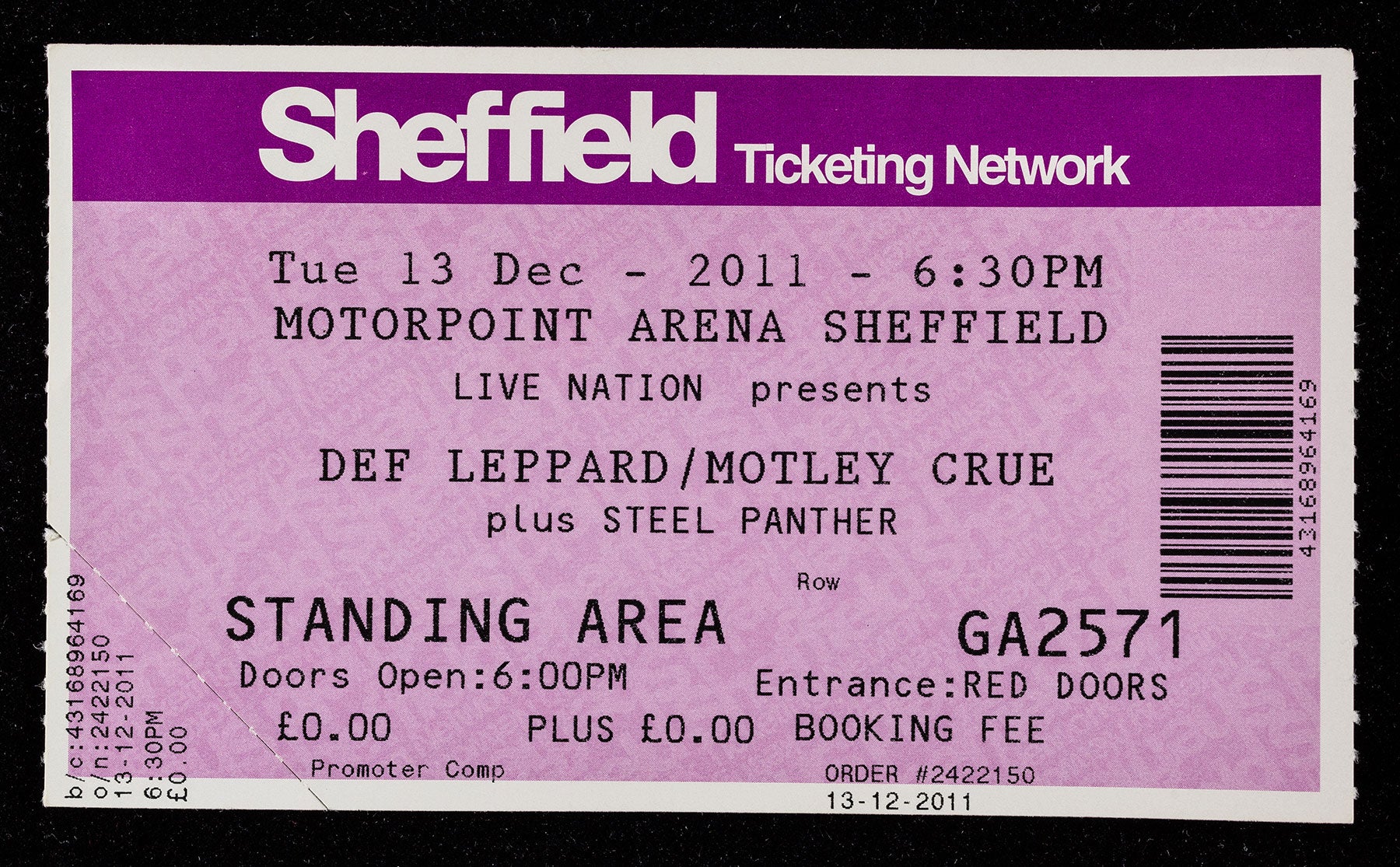 Ticket for the Def Leppard Mirrorball Tour stop at Motorpoint Arena Sheffield (also known as Sheffield Arena), 13 December 2011. From the Collection of Joe Elliott.