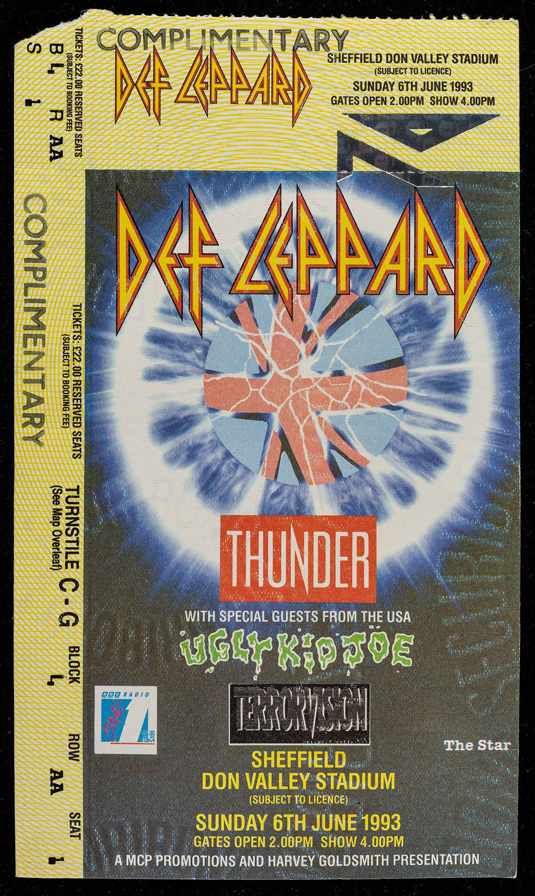 Ticket from the 6 June 1993 performance at Don Valley Stadium in Sheffield, England, the stadium's inaugural show. Def Leppard was proud to play this important event with nearly 50,000 fans in attendance. From the Collection of Joe Elliott.