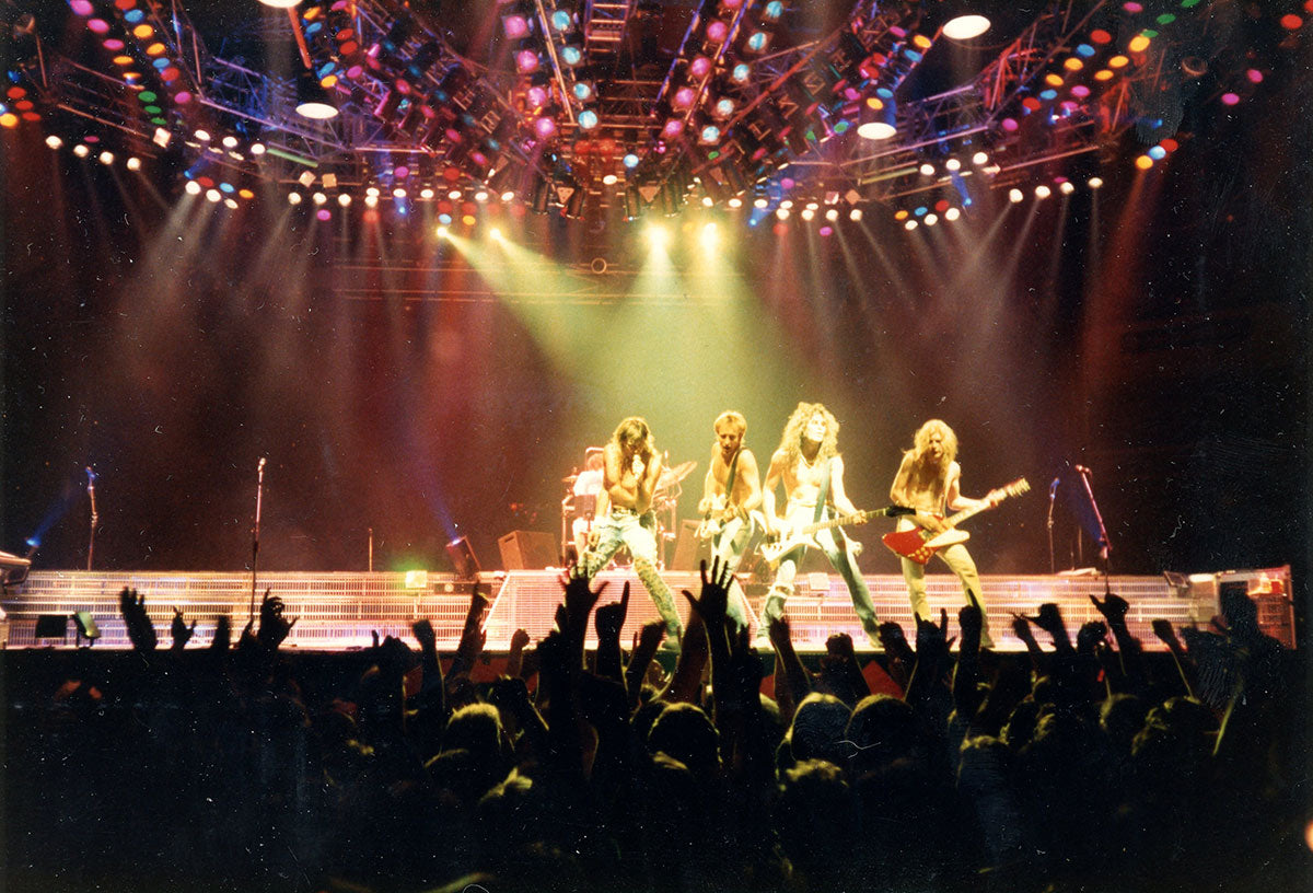 Joe, Sav, Phil, and Steve play to opposite sections of the audience while Rick holds court center stage, Hysteria Tour, circa 1988. Photo: Ross Halfin. From the Collection of Def Leppard.