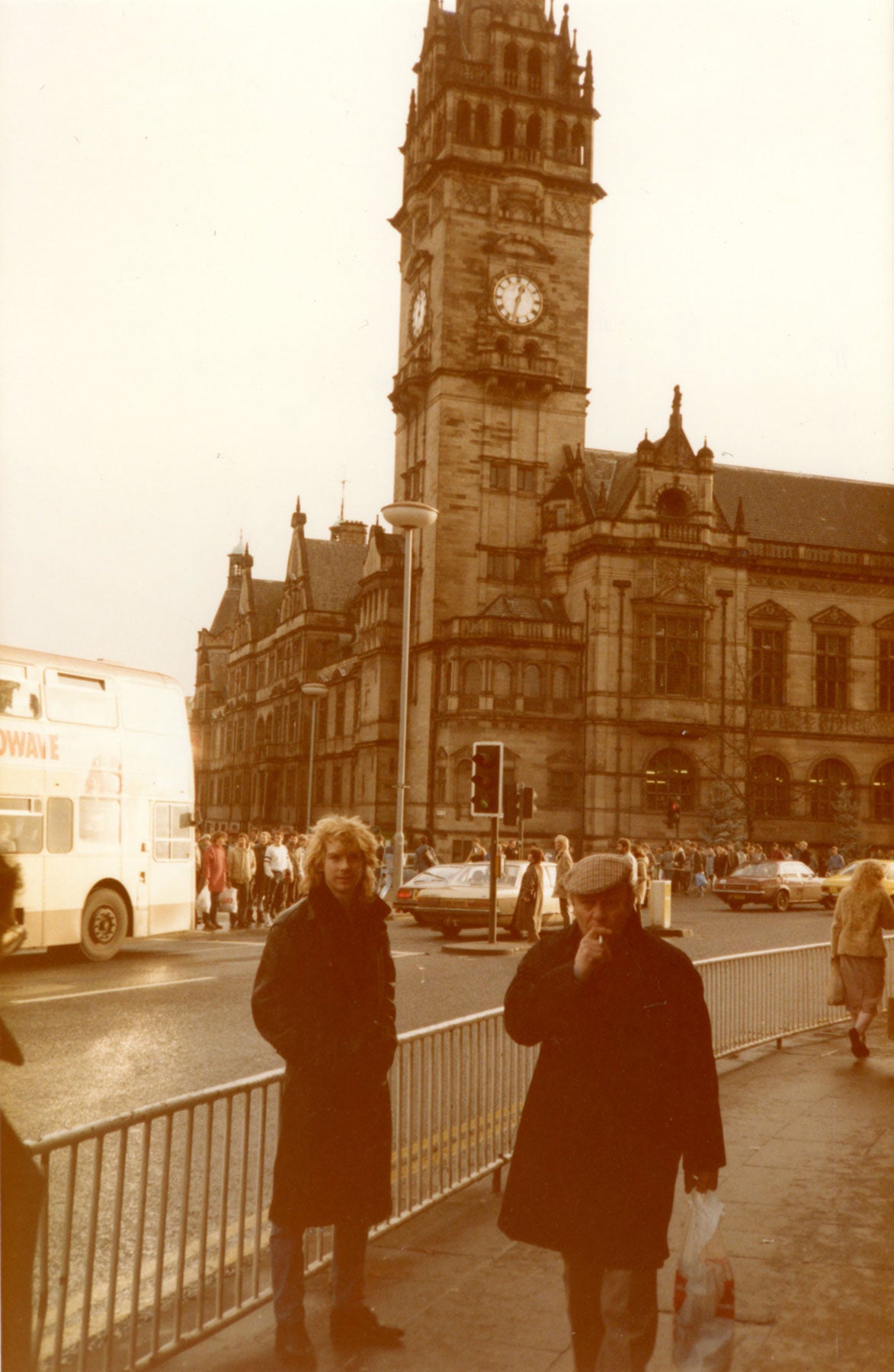 Steve stands outside beautiful Sheffield Town Hall during a Christmas break from the Pyromania Tour, 1984. Photo: Lorelei Shellist. Courtesy of the Lorelei Shellist Private Collection.
