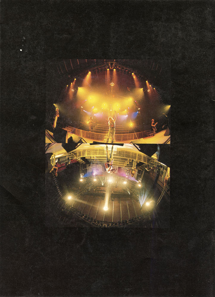 In-the-Round staging was a workout for the band. Joe, Sav, Phil, and Steve were constantly on the move playing to the surrounding audience, and Rick played on a rotating drum riser. Phil noted, "Not a bad seat in the house. But it meant we had to work extra hard as it was like having four front rows." Photo: Ross Halfin. From the Collection of Def Leppard.