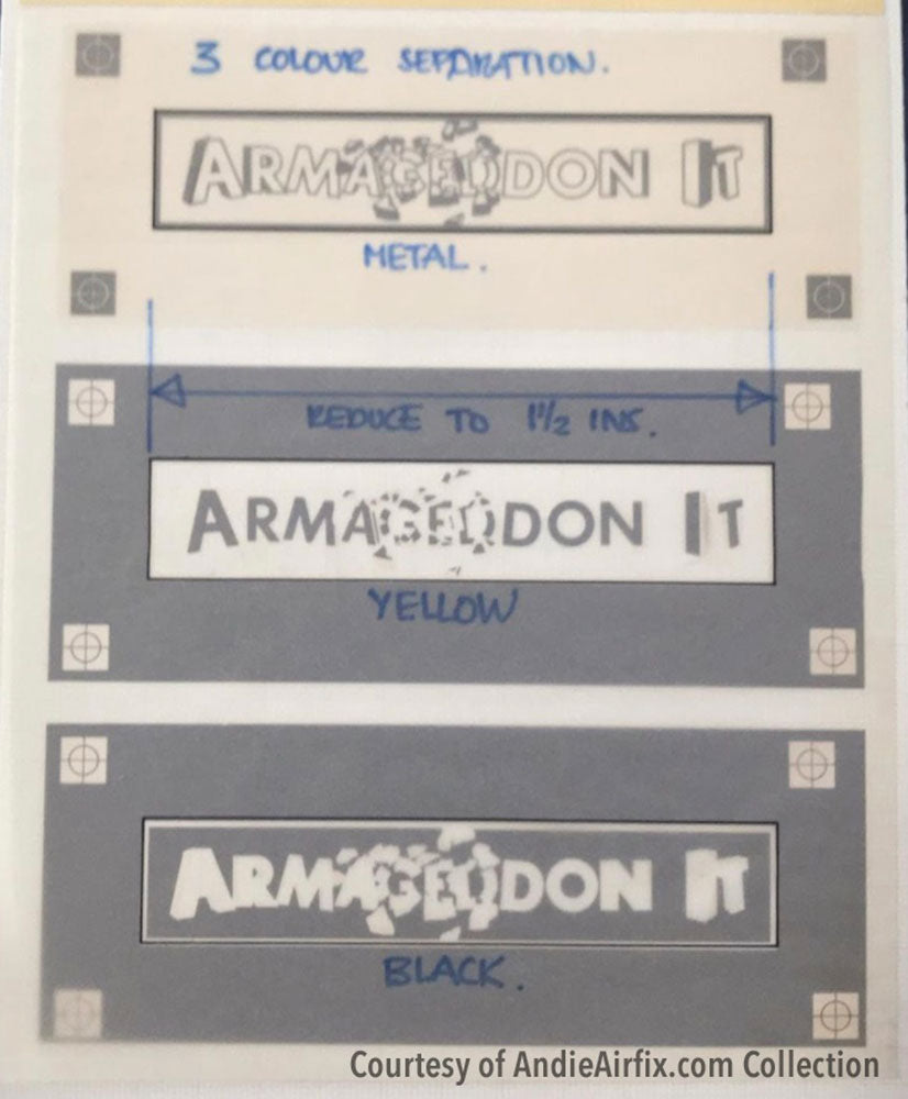 Andie Airfix original artwork with handwritten notes for the "Armageddon It" single sleeve. From Richard Clark-Monks, The Andie Airfix Collection.