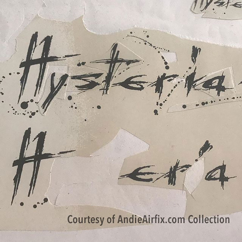 Andie Airfix's Hysteria's logo in development, with cut outs, glued pieces, and ink splatters. Phil described Airfix's process of creating art with the band as similar to making a record. "You record a demo and sometimes you're not even sure what it is - it's an expression." From Richard Clark-Monks, The Andie Airfix Collection.