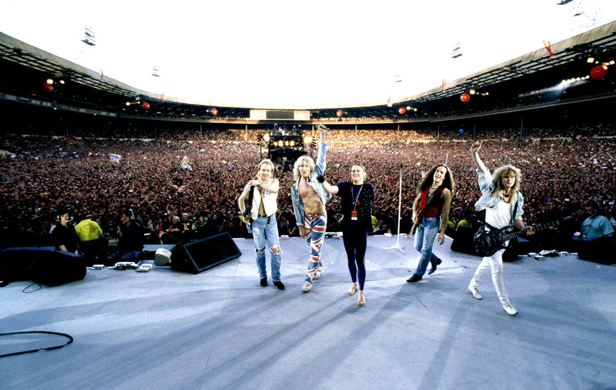 Phil, Joe, Rick, Viv, and Sav leave the audience screaming for more at the Freddie Mercury Tribute - A Concert for Life. An audience of 72,000 in-person, and an estimated billion viewers via television and radio welcomed Viv to the band for his very first large Def Leppard show, 20th April 1992. Photo: Ross Halfin. From the Collection of Def Leppard.
