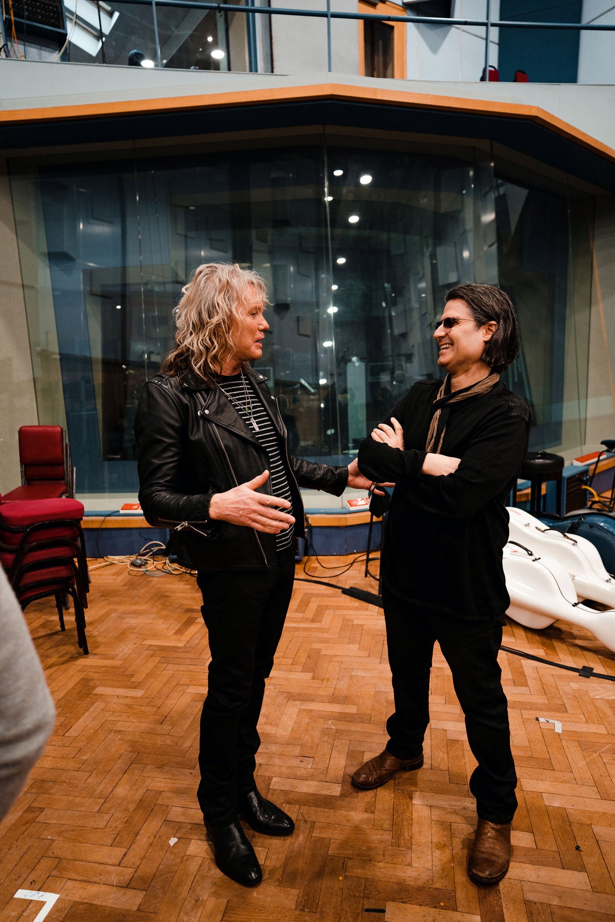 Joe and Phil listen to a Drastic Symphonies recording session in the Abbey Road control room, March 2022. Photo: Ryan Sebastyan. From the Collection of Def Leppard.