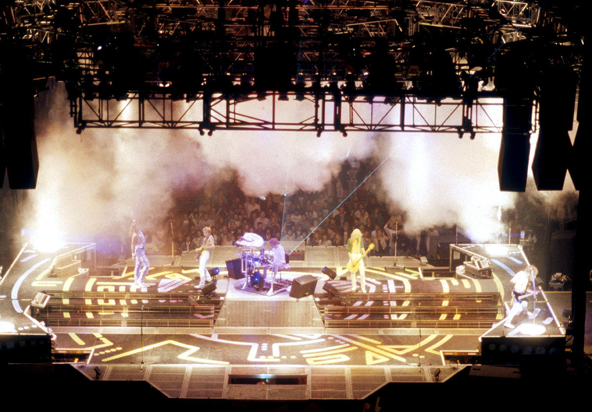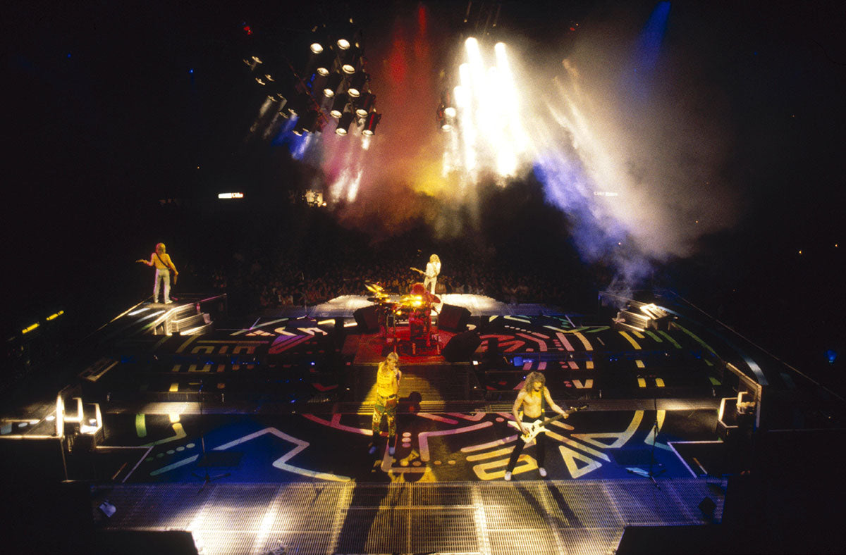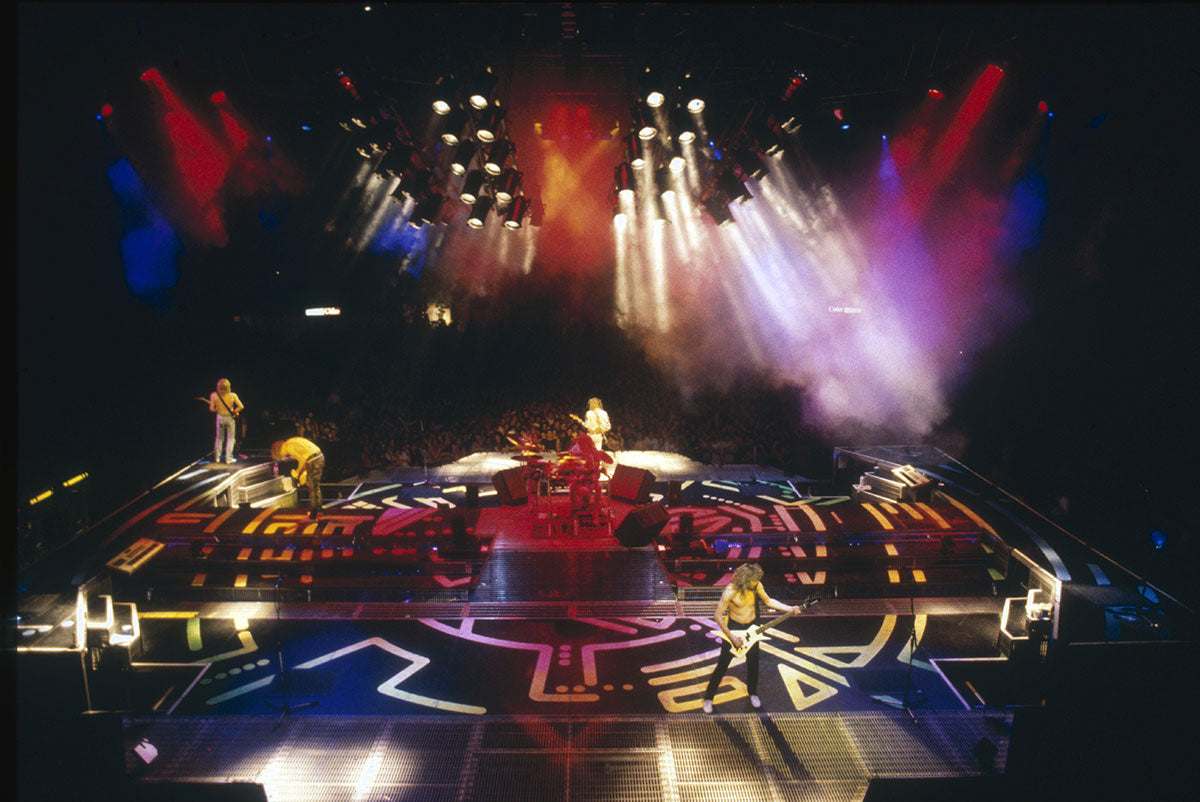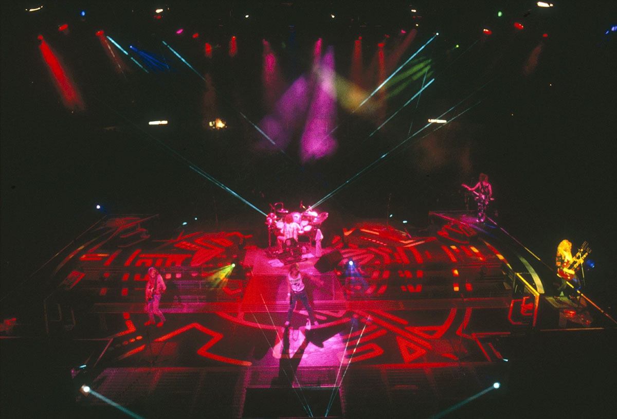 Hysteria Tour, in-the-round configuration, circa 1988. Pioneering light designer Howard Ungerleider deployed lasers under the stage using trap doors and mirrors. Photo: Ross Halfin. From the Collection of Def Leppard.