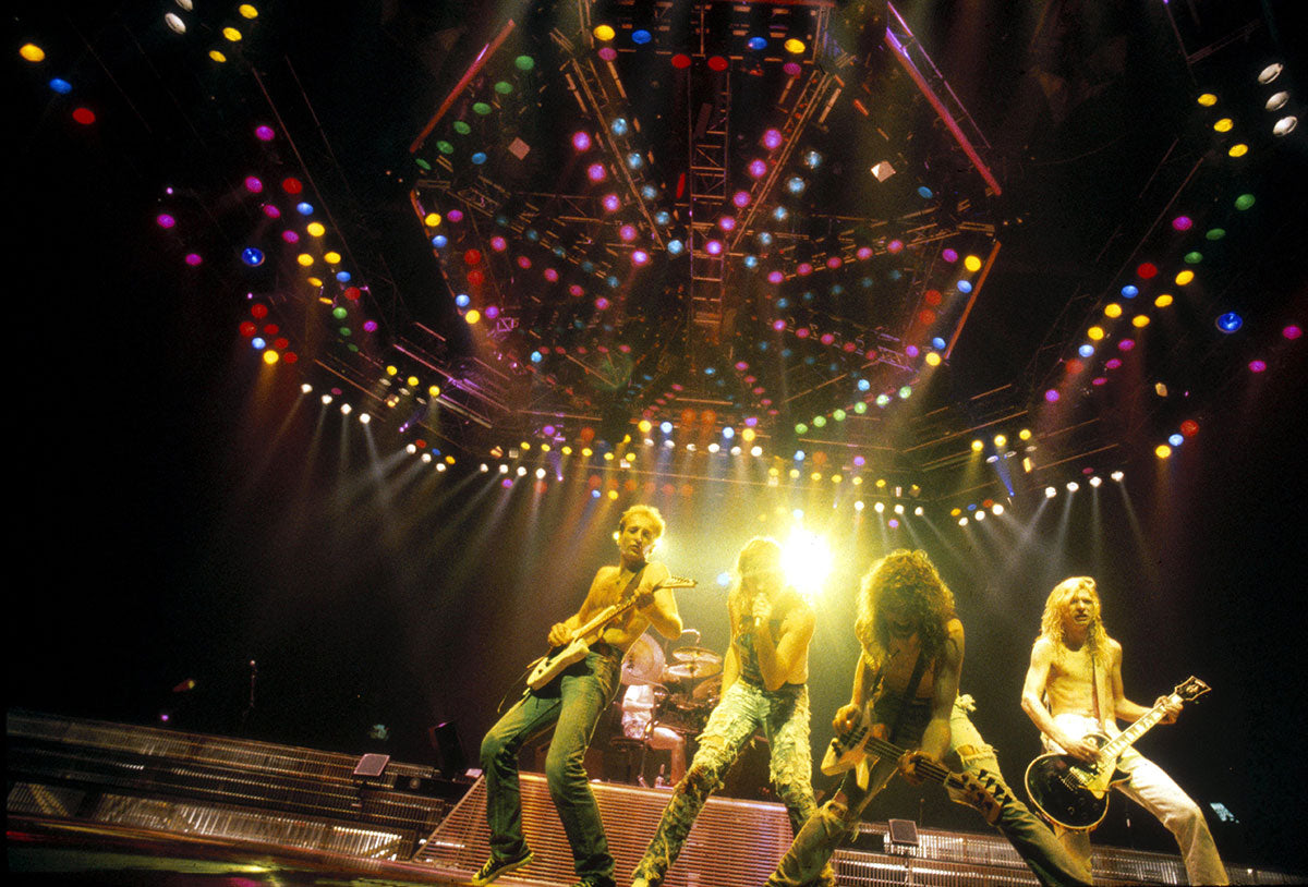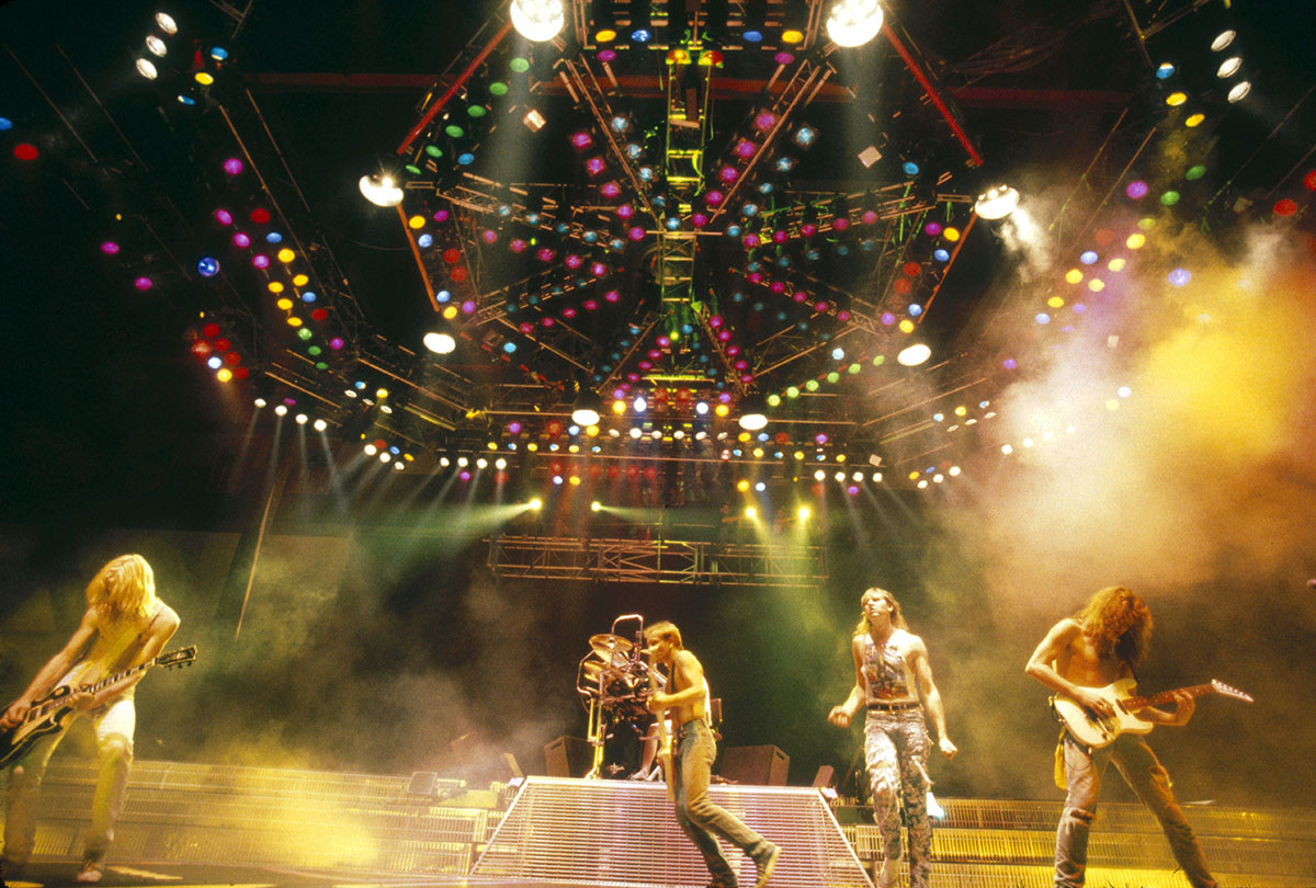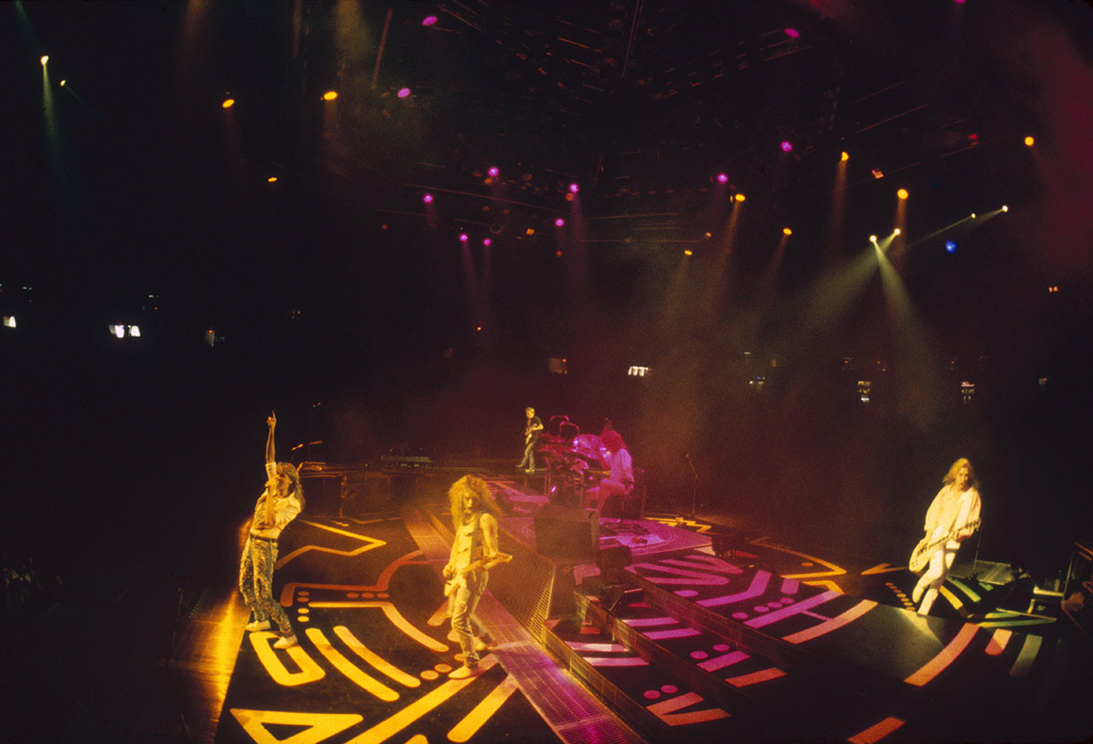 Hysteria Tour, in-the-round configuration, circa 1988. Pioneering light designer Howard Ungerleider deployed lasers under the stage using trap doors and mirrors. Photo: Ross Halfin. From the Collection of Def Leppard.