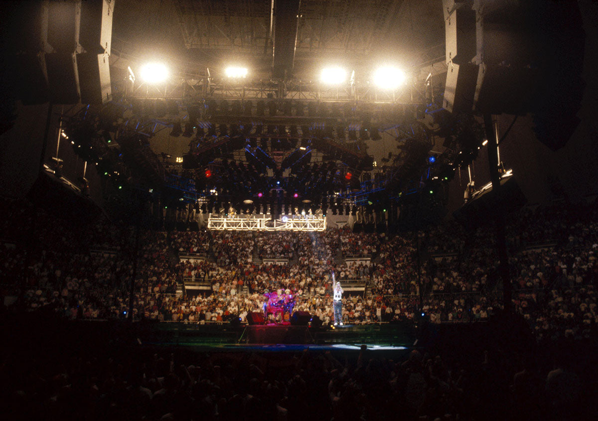 A lights-up view of the Hysteria Tour, in-the-round configuration, circa 1988, with fog effect starting to pour onto the stage. Photo: Ross Halfin. From the Collection of Def Leppard.