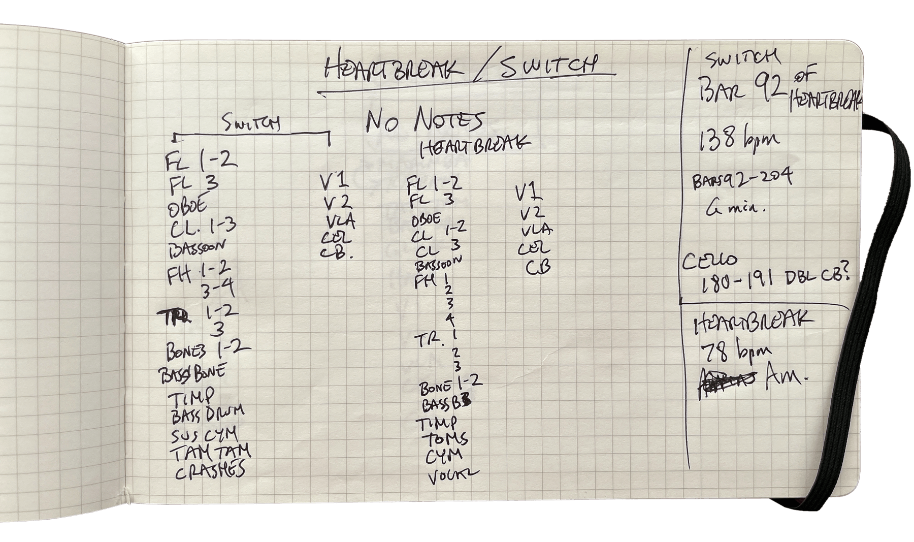 Eric Gorfain's notes for "Bringin' On the Hearbreak" and "Switch 625". Eric described the inspiration: "I wrote an arrangement for 'Bringin’ on the Heartbreak' and the band loved it so much that they said, could you add 'Switch 625'? I thought they’d never ask! I loved working with the original tracks, led by Steve Clark’s and Pete Willis’ guitars." Photo: Eric Gorfain.