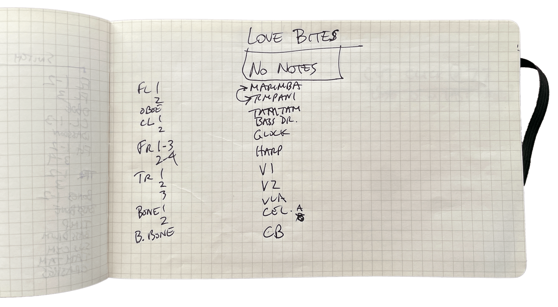Arranger Eric Gorfain's notes for "Love Bites" as recorded for Drastic Symphonies, March 2022. Photo: Eric Gorfain.