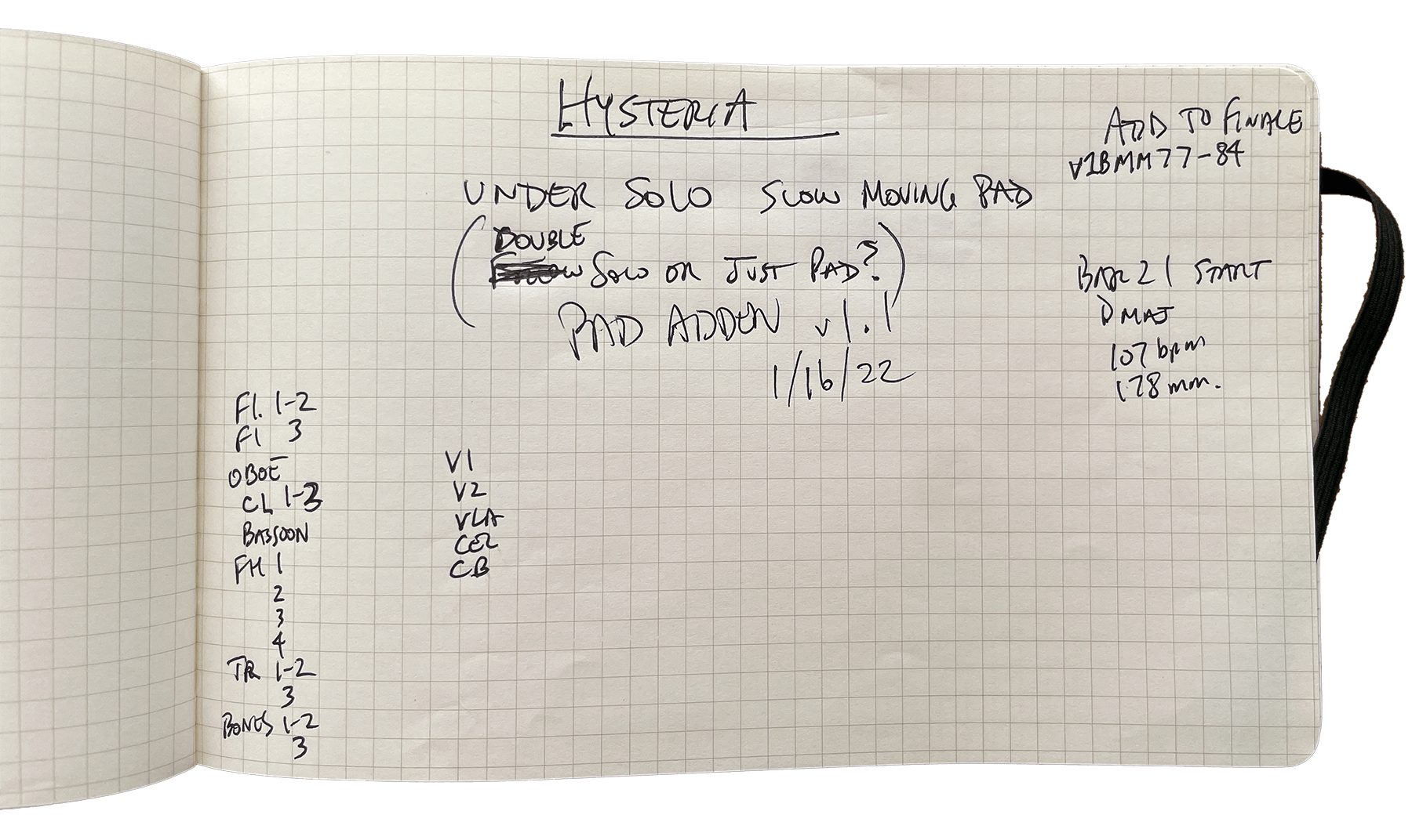 Eric Gorfain's notes for "Hysteria" as recorded for Drastic Symphonies, March 2022. Photo: Eric Gorfain.