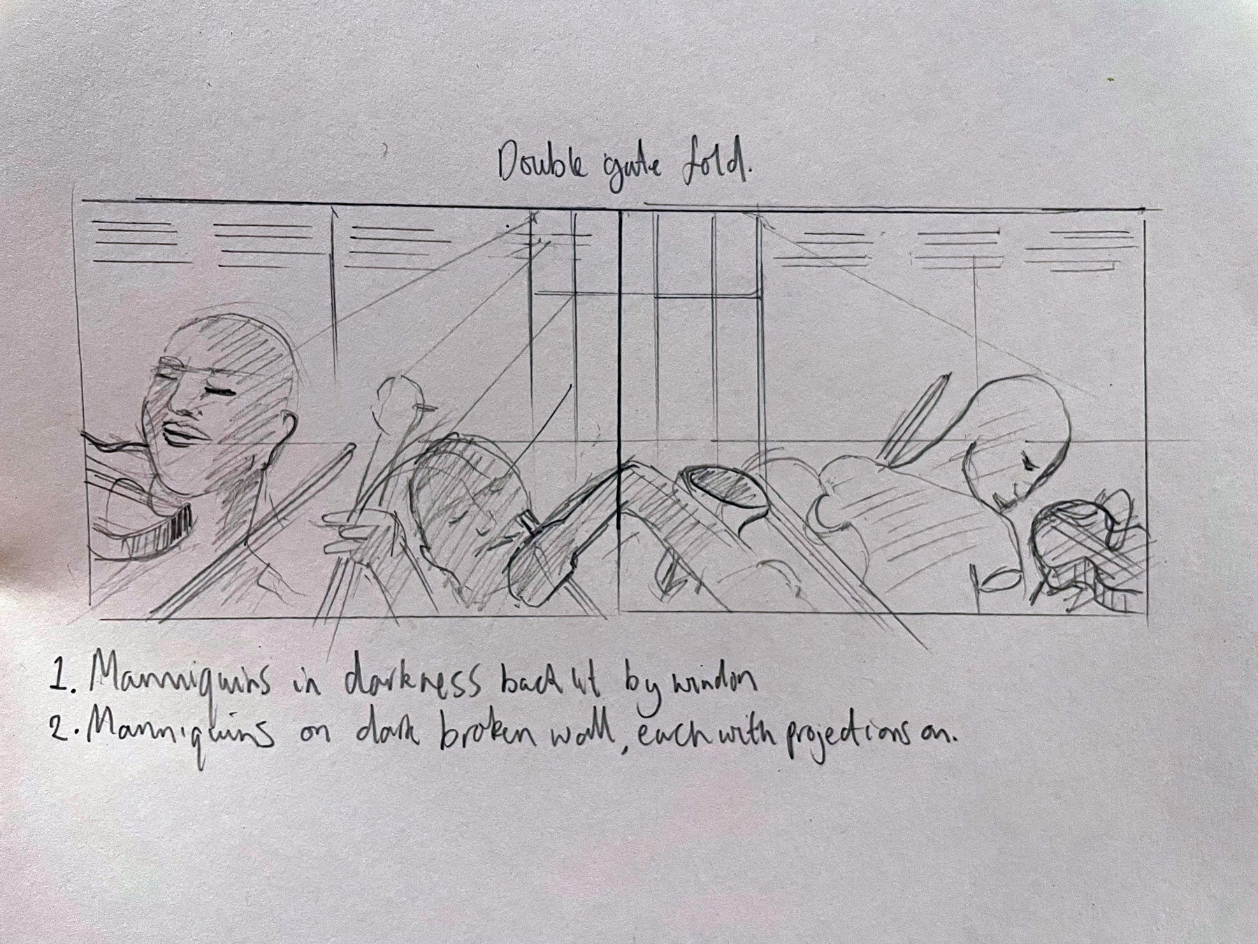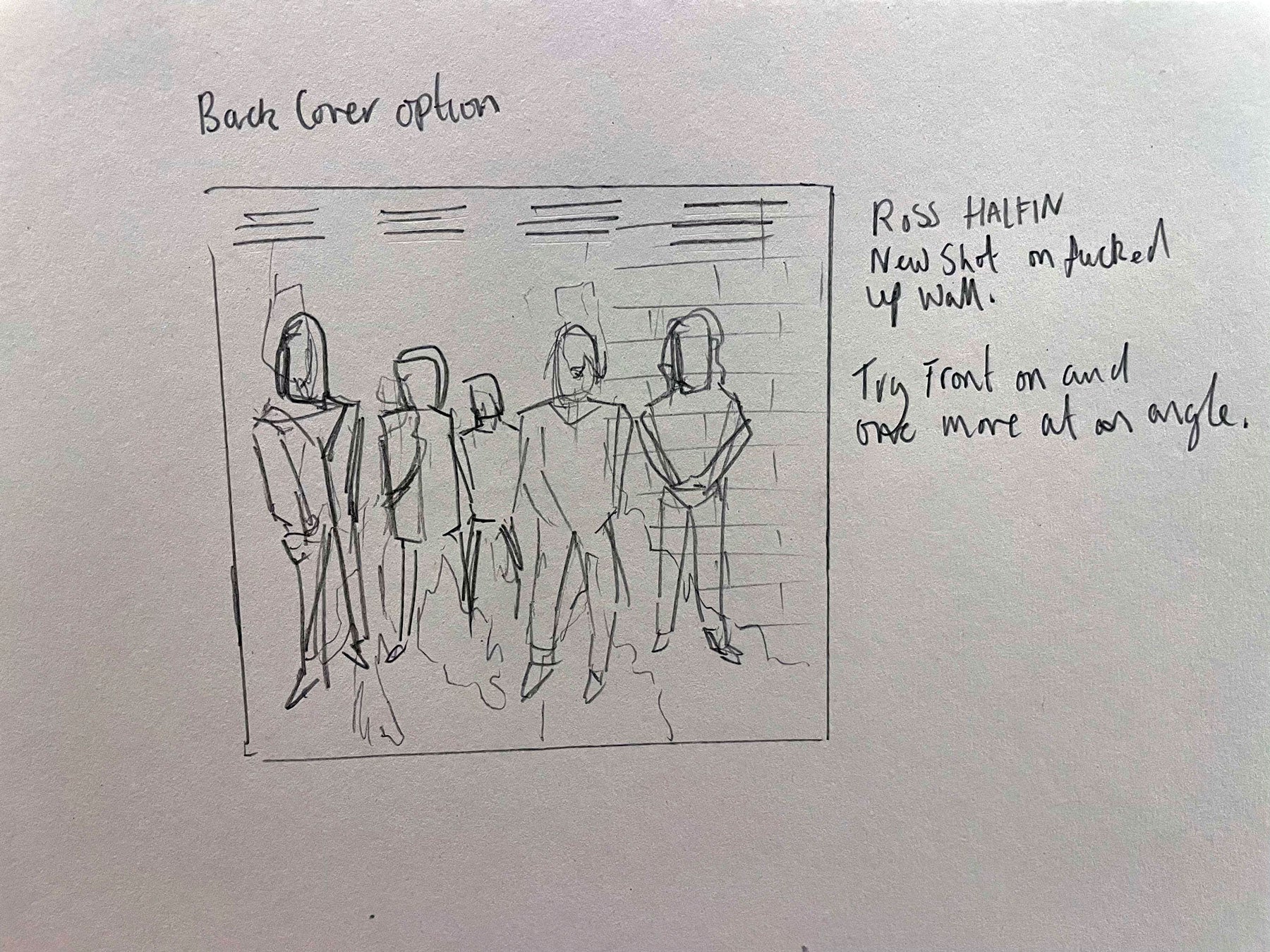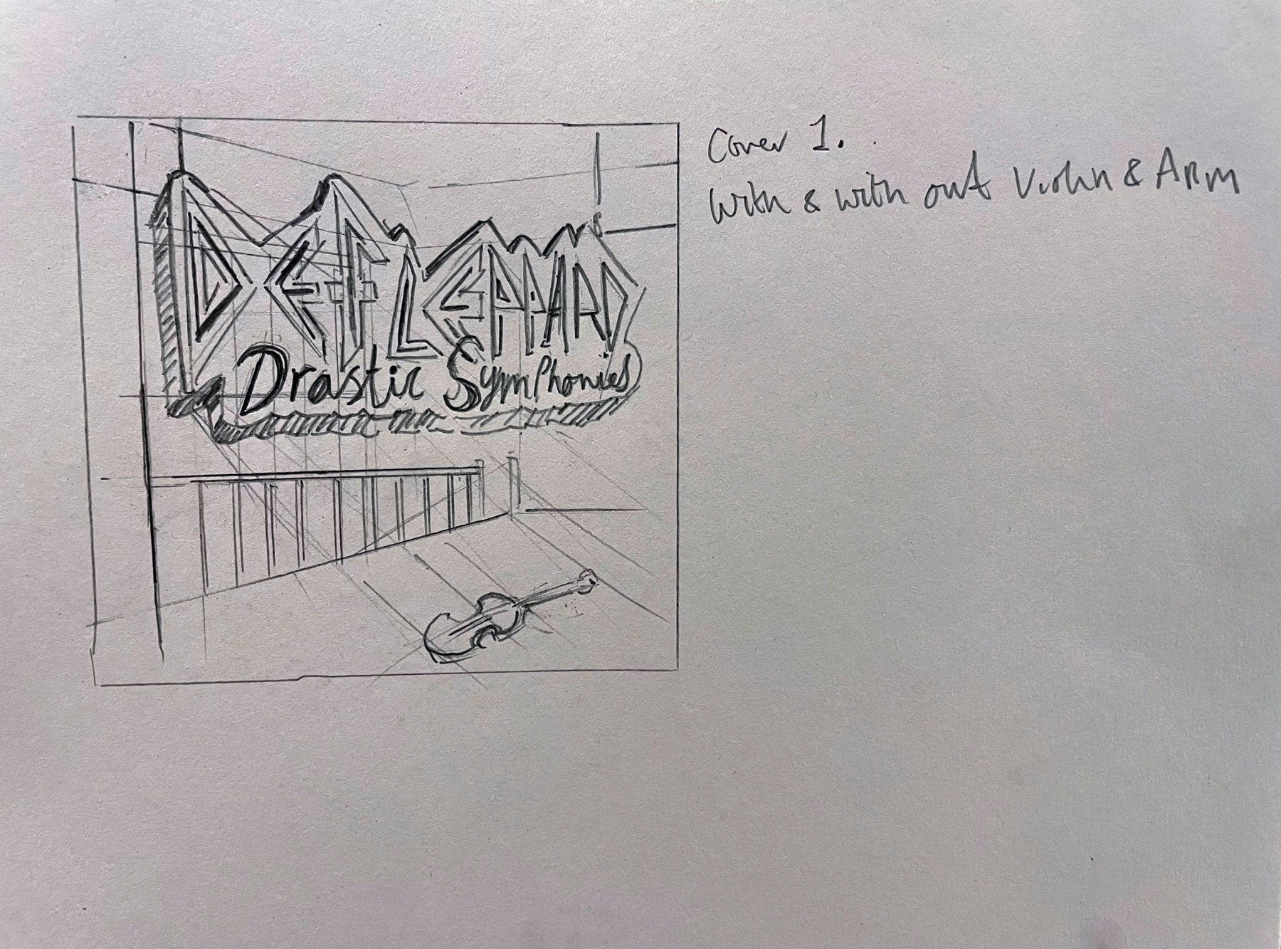 Hand-drawn draft of the Drastic Symphonies gatefold art, designed by Ellen Wright-Martin, 2002. Wright-Martin developed the mannequin motif for the album's art design based on a suggestion from Joe Elliott. "Joe mentioned using mannequins in one of our chats about the creative for the album. This was then developed into semi-destroyed mannequins set out in the formation of an orchestra, all posed with their instruments in hand, mid-performance." Courtesy of Ellen Wright-Martin.