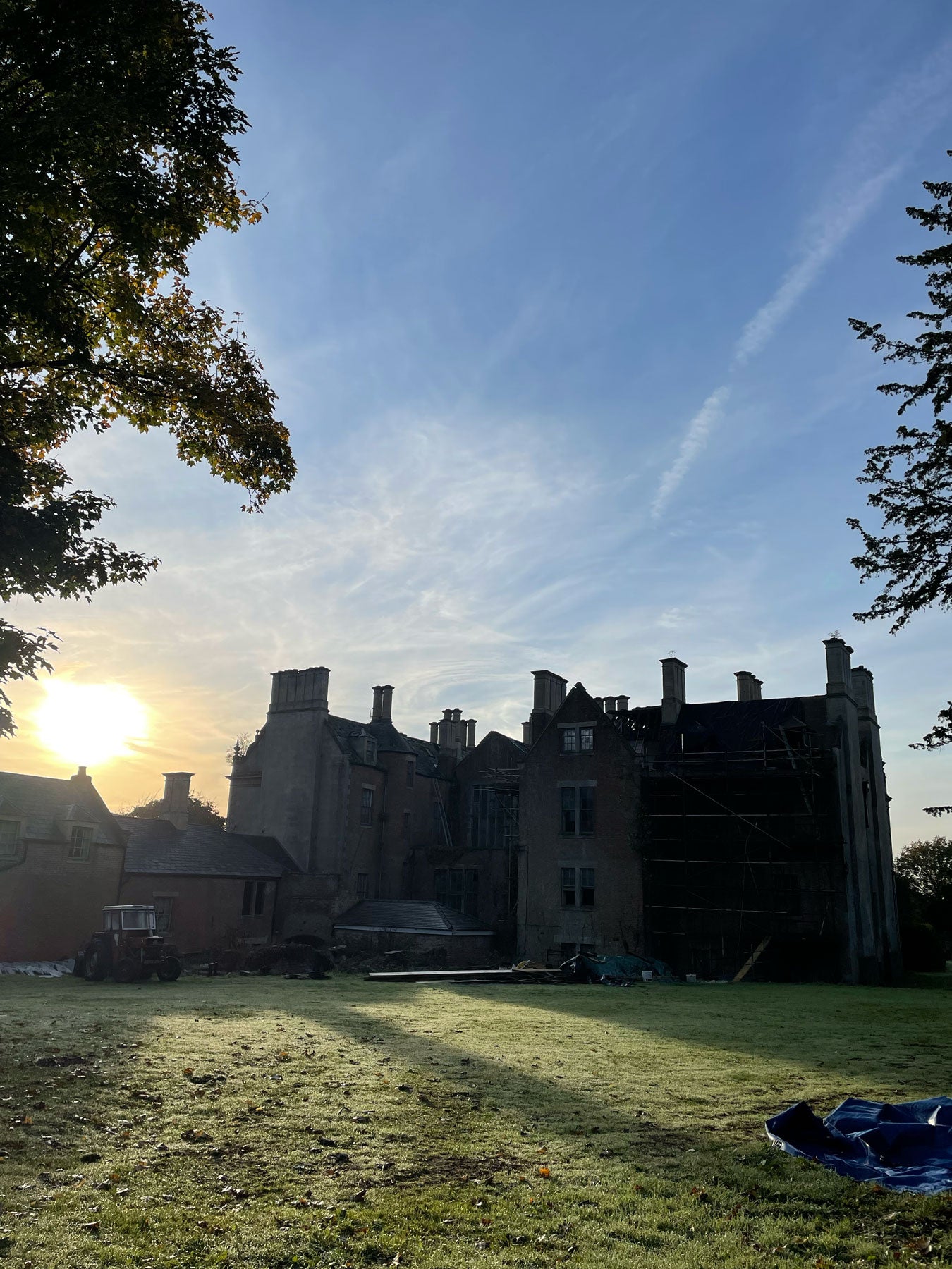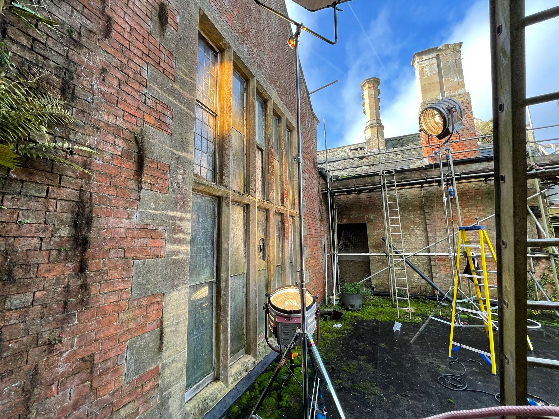 Lights outside the windows add atmosphere to the Yorkshire manor house where Drastic Symphonies photography and video took place, 2022. Courtesy of Ellen Wright-Martin.