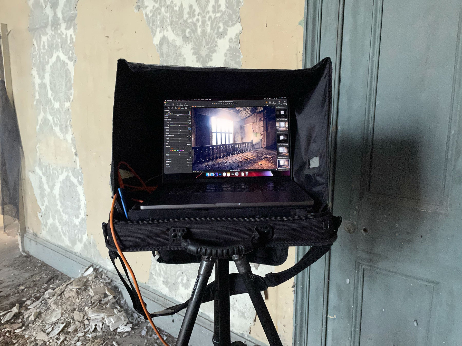A video monitor captures part of the Yorkshire manor house used for Drastic Symphonies art design. This area was eventually used for the album's cover art. Courtesy of Ellen Wright-Martin.
