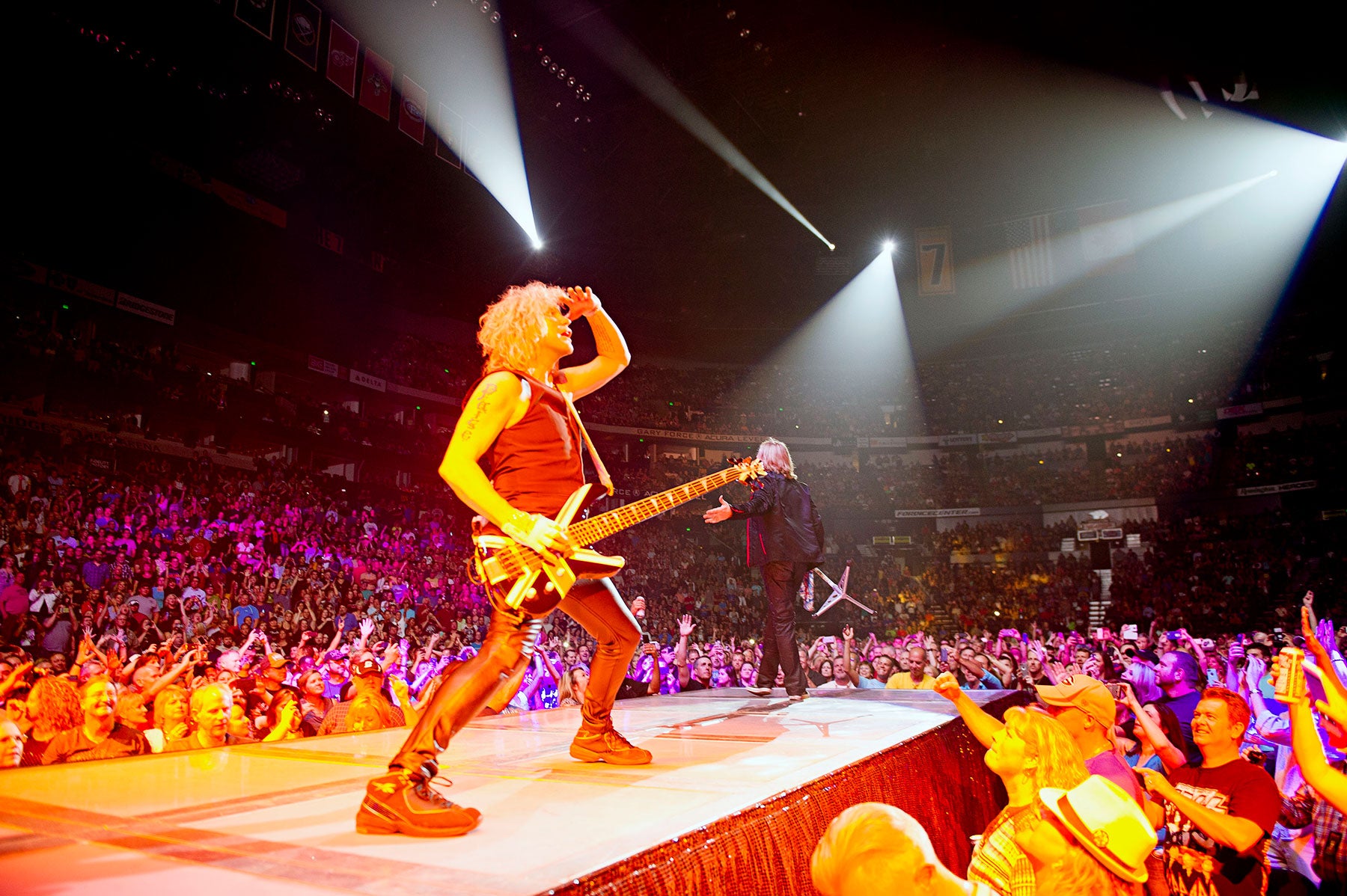 Sav and Joe work the crowd at the Bridgestone Arena, Nashville Tennessee, 2015 World Tour, August 2015. Photo: Ross Halfin. From the Collection of Def Leppard.