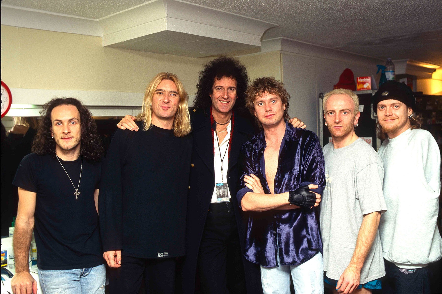 Brian May visits Viv, Joe, Sav, Phil and Rick backstage at a meaningful Slang Tour stop at Wembley Arena, November 1996. The band was thrilled to play at this legendary venue. Photo: Ross Halfin. From the Collection of Def Leppard.
