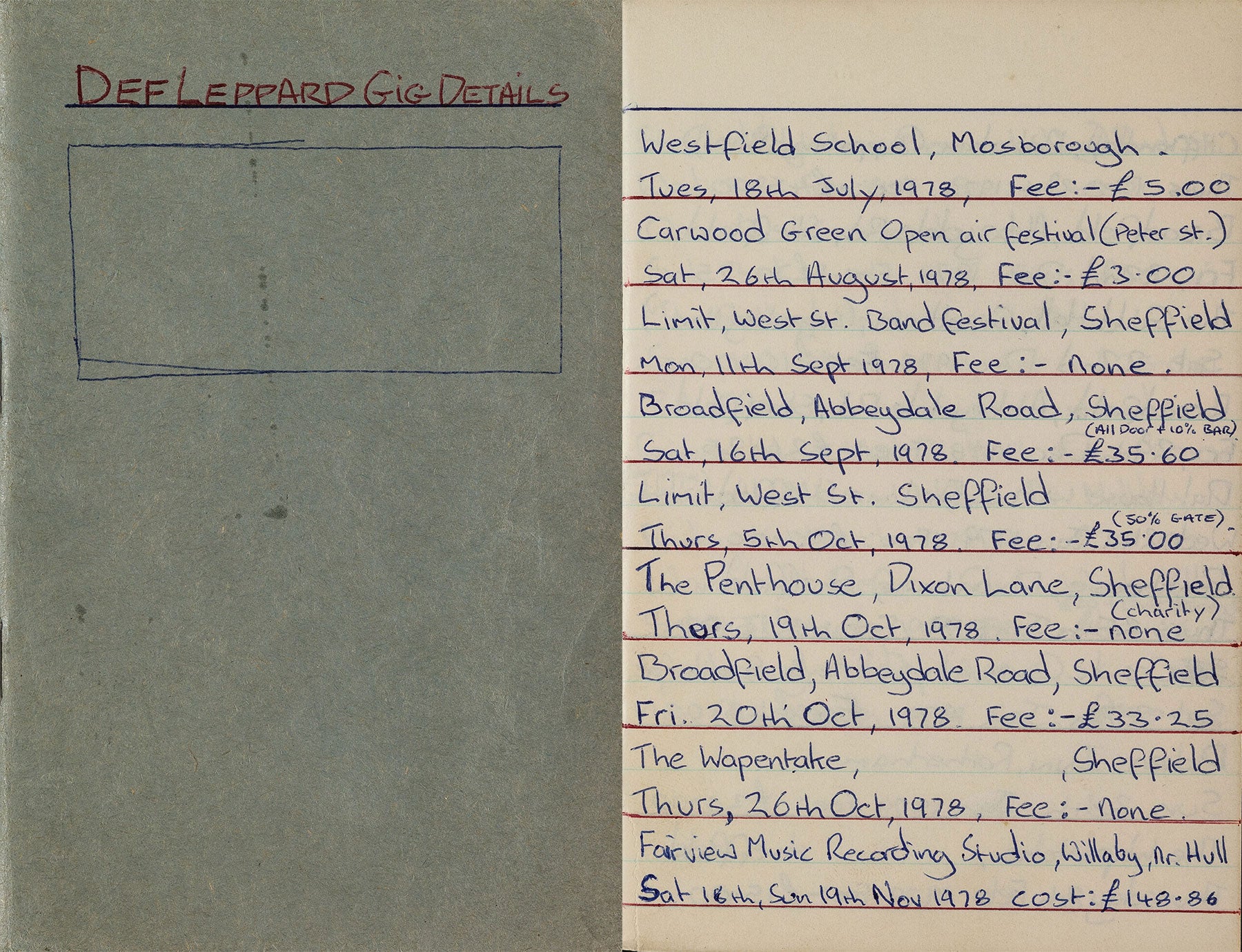 Joe Elliott's personal notebook with handwritten notes detailing Def Leppard's first public performances. The notebook registers the show date, location, and fee the band was paid (if any). Note the speed with which the band goes from their first public show at Westfield School, 18 July 1978 to recording the Def Leppard EP at Fairview Music Recording Studio, 18 November 1978. From the Collection of Joe Elliott.