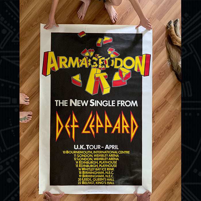 Collecting is much more than the treasure hunt its people. I love people because each and every one of us is different, do you see the color blue the same way I see it? Everyone is unique on their views, likes, dislikes but there is one common thread to everyone. Music. Music is the one thing that will bring complete strangers into the same room to listen to the same artist / band. I’m fortunate that regardless of where I worked I met Def Leppard fans. Some collected the albums while others, like me, collected memorabilia. Insert Jeremy. It was understandable that we’d become friends at work as we were the only two that had longer hair than the receptionists and he too played guitar. We’d hang out after work sometimes (we lived a considerable distance apart and his only vehicle was the company truck which cannot be used for personal business) he was aware I was a collector of Def Leppard. I went through my entire collection with him, things I was looking for, or things, like a simple poster, I’ve missed. As the story goes, Jeremy is searching eBay for nothing in particular when he sees the poster I was talking about and it was cheap, as he said. He presented it to me on my 30th Birthday. This poster brings back memories of my days way back when. It feels like how I remember it. The ink has a texture. And its as massive as I remember. I have several posters spanning across much of their albums, group shots, promos, tapestries but nothing compares to this one in its vibrancy and although it doesn’t seem like much it is the work of Mr. Airfix. I do not know if Armageddon It is the last thing Andie worked on during Hysteria but it is an explosion of beauty.