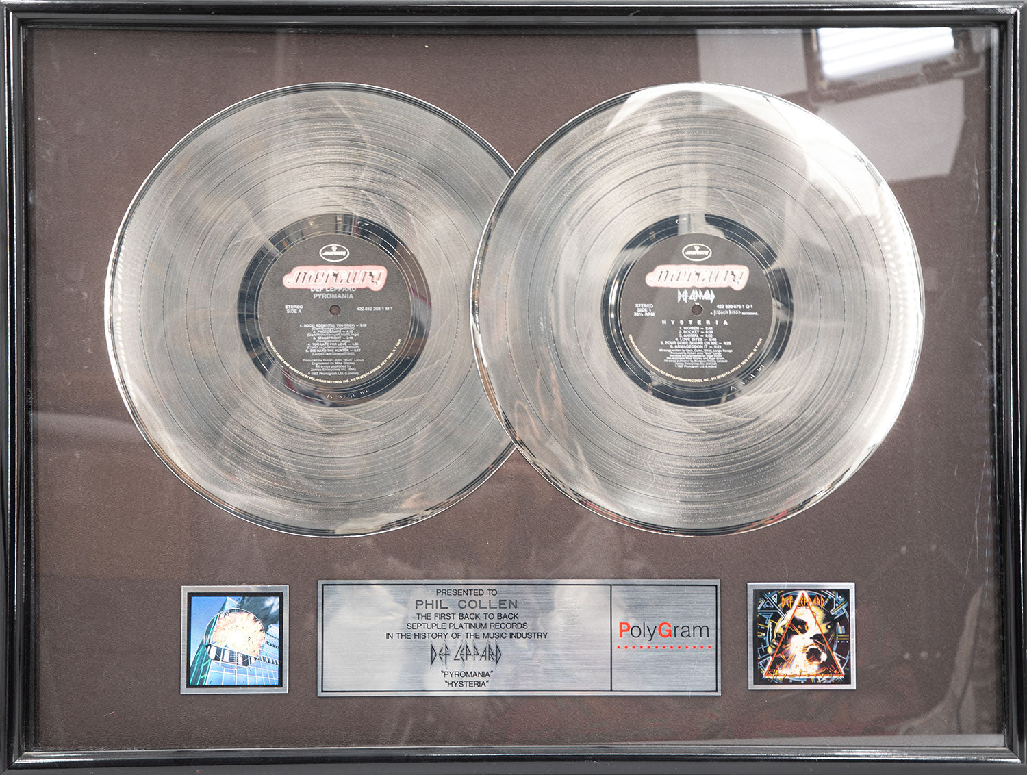 Award presented to Phil Collen in recognition of back-to-back septuple platinum sales of Pyromania and Hysteria in 1988. It was a first in music history. From the Collection of Phil Collen.