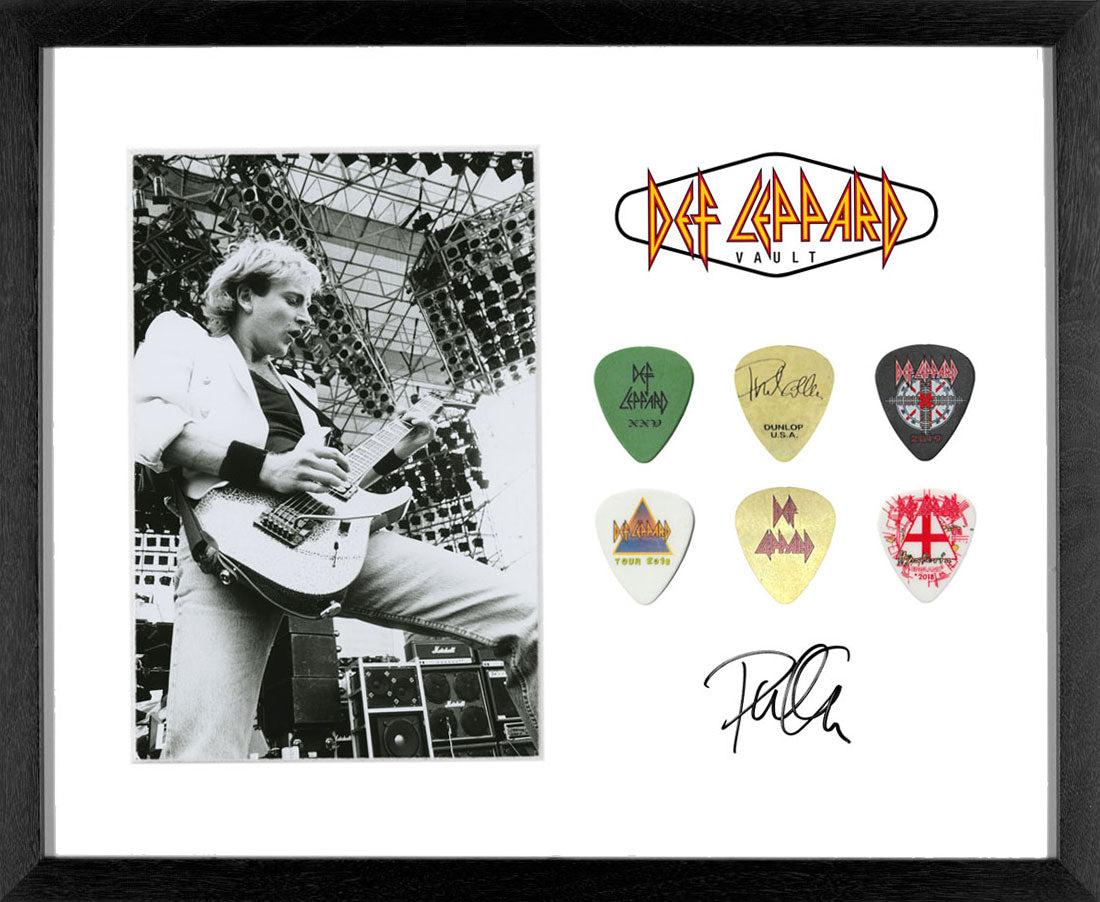 Collection of six guitar picks created for Phil's use, including his steel Dunlop used in performances around the world. Photo: Ross Halfin. From the Collection of Def Leppard.