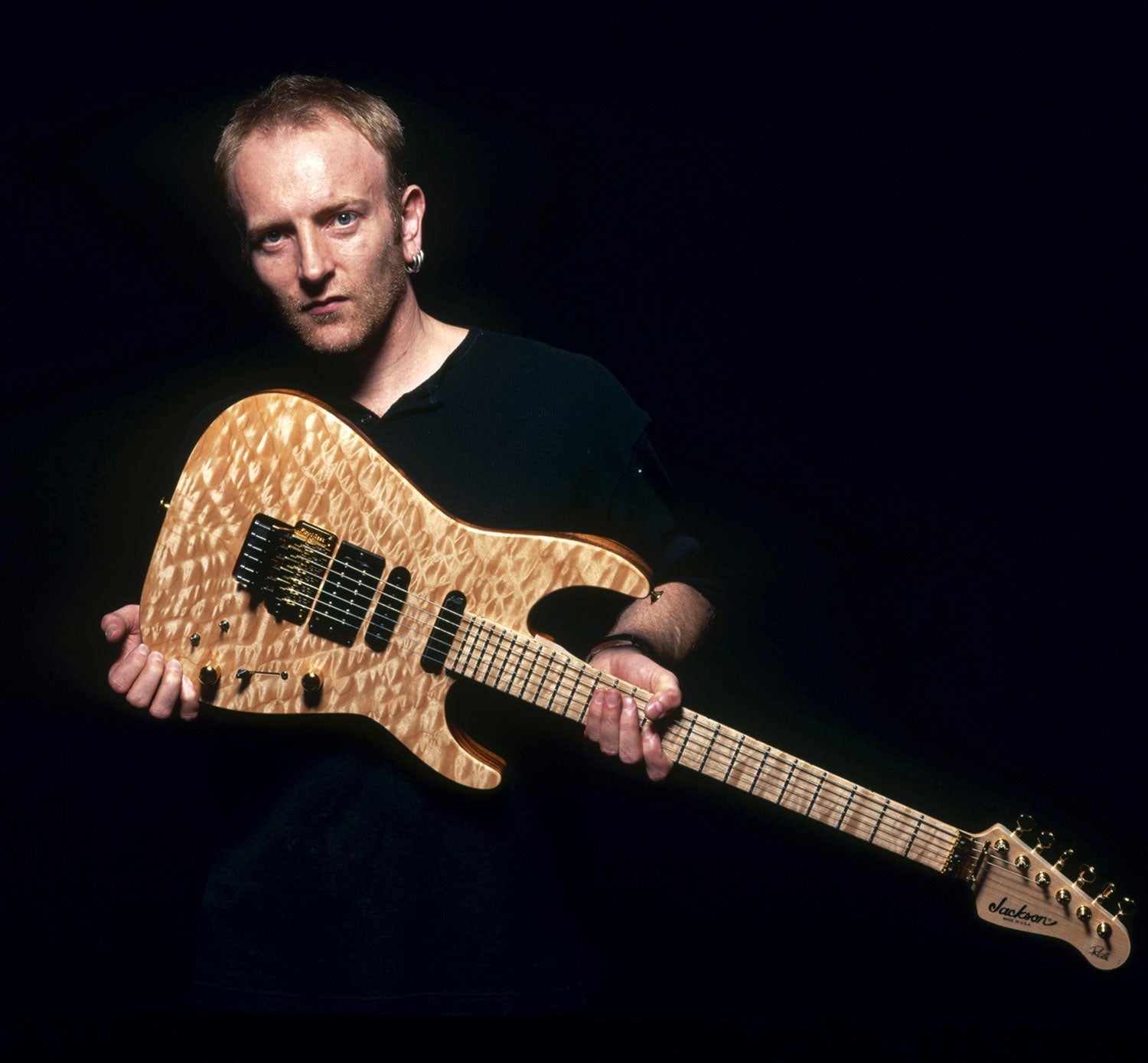 Portrait of Phil with his Jackson PC1, "Au Naturel," circa 1996. It has less paint and finish on it to obtain a more vibrant sound. From the Collection of Phil Collen.