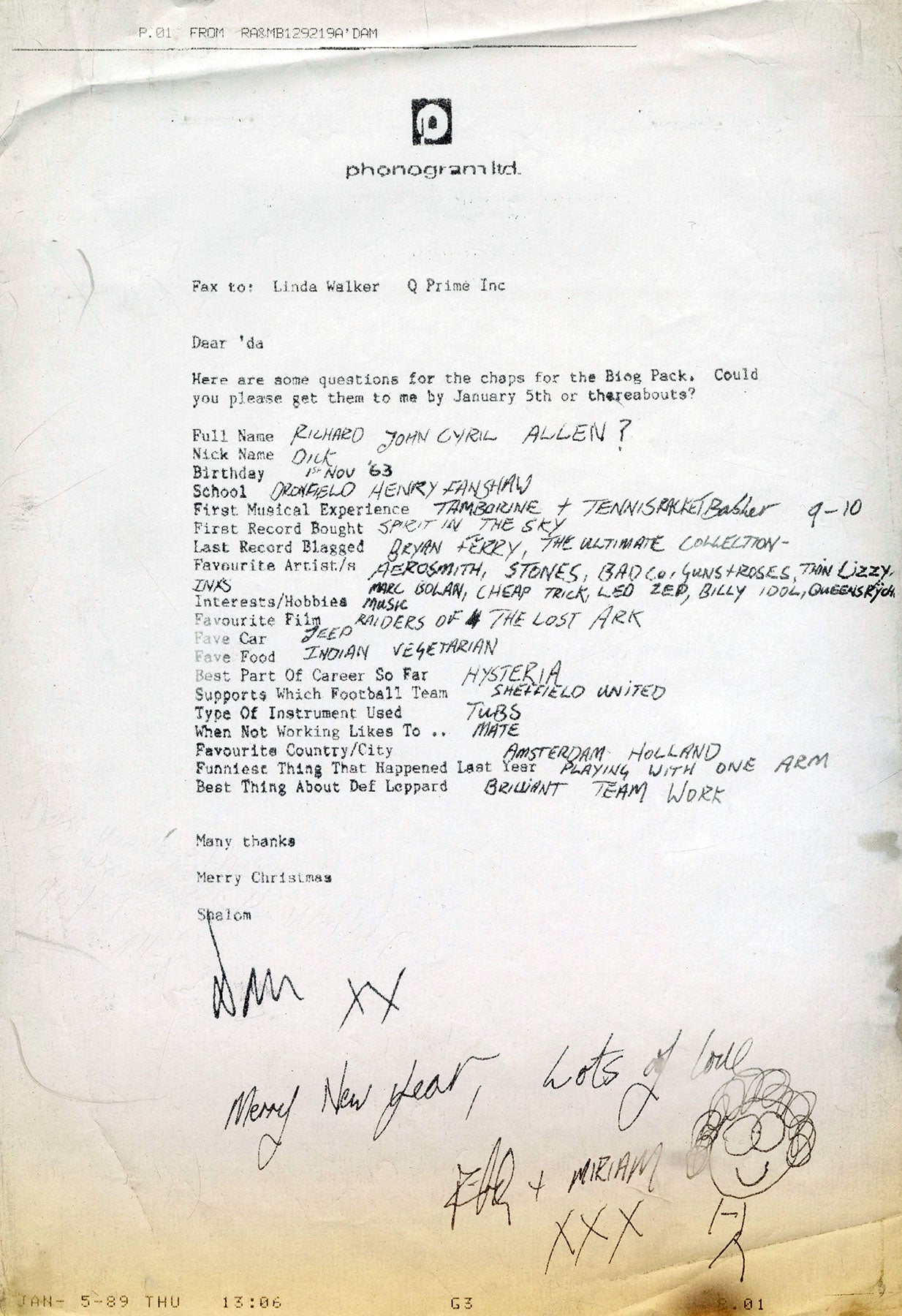 Faxed correspondence from Rick to Q Prime with Rick's handwritten answers to various personal questions, 5 January 1989. From the Collection of Def Leppard.