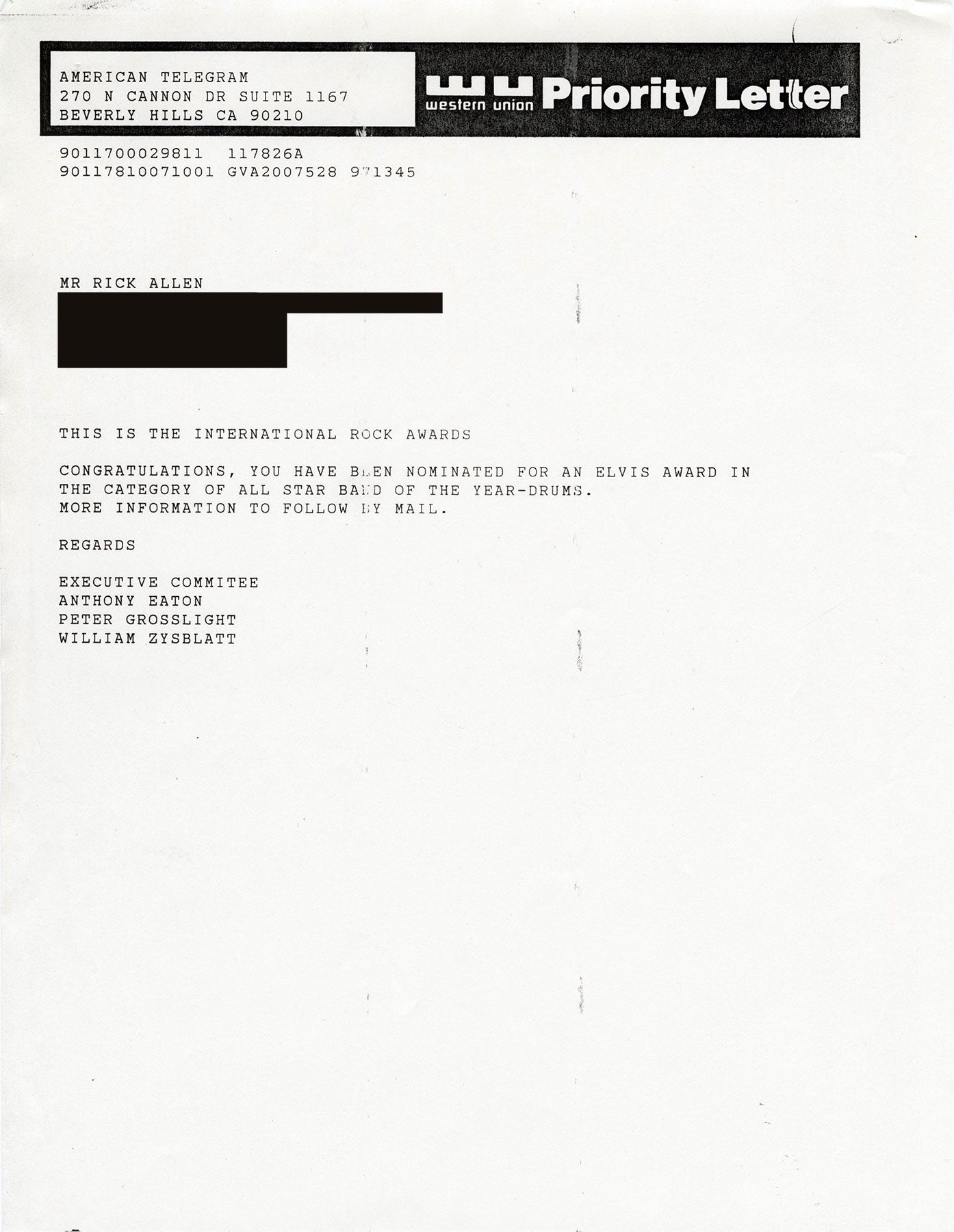 Telegram notifying Rick of his International Rock Awards nomination in the category of All Star Band of the Year – Drums. Def Leppard was also nominated for Artist of the Year. The ceremony was held at the 69th Battalion State Armory, New York City, 31 May 1989. From the Collection of Def Leppard.